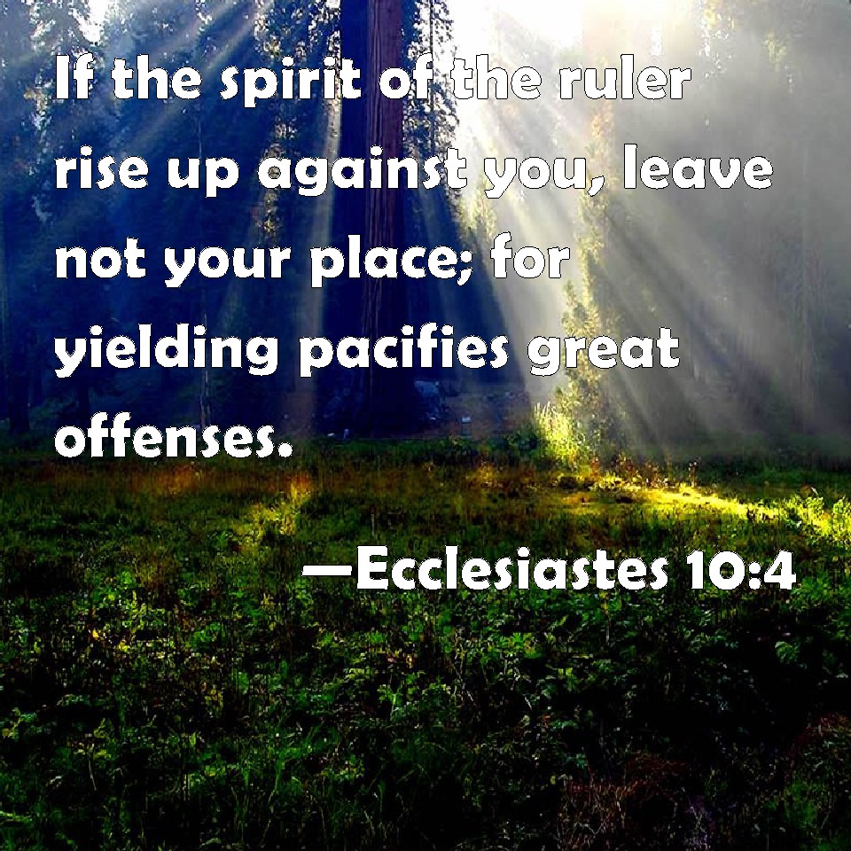 Choose a Background Ecclesiastes 10:4 If the spirit of the ruler rise up against you, leave not your place; for yielding pacifies great offenses. KJV: If the spirit of the ruler rise up against thee, leave not thy place; for yielding pacifieth great offences. DRB: If the spirit of him that hath power, ascend upon thee, leave not thy place: because care will make the greatest sins to cease. DBT: If the spirit of the ruler rise up against thee, leave not thy place; for quietness pacifieth great offences. ERV: If the spirit of the ruler rise up against thee, leave not thy place; for yielding allayeth great offences. WBT: If the spirit of the ruler riseth against thee, leave not thy place; for yielding pacifieth great offenses. WEB: If the spirit of the ruler rises up against you, don't leave your place; for gentleness lays great offenses to rest. YLT: If the spirit of the ruler go up against thee, Thy place leave not, For yielding quieteth great sinners.Links Ecclesiastes 10:4 NIV • Ecclesiastes 10:4 NLT • Ecclesiastes 10:4 ESV • Ecclesiastes 10:4 NASB • Ecclesiastes 10:4 KJV • Ecclesiastes 10:4 Interlinear • Ecclesiastes 10:4 Commentaries • Ecclesiastes 10:4 Parallel Texts • Ecclesiastes 10:4 Bible Apps • Ecclesiastes 10:4 Parallel • Bible Hub |