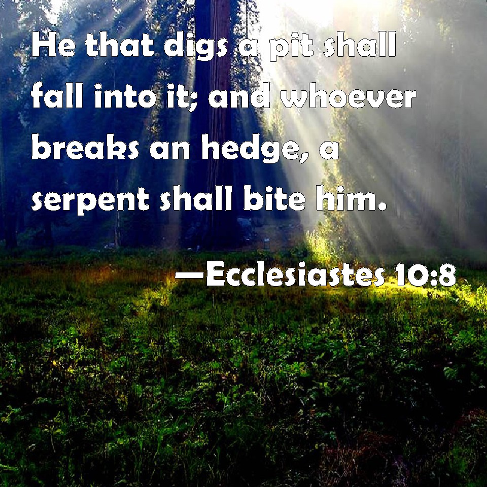 Ecclesiastes 10:8 He that digs a pit shall fall into it; and whoever breaks an hedge, a serpent shall bite him.