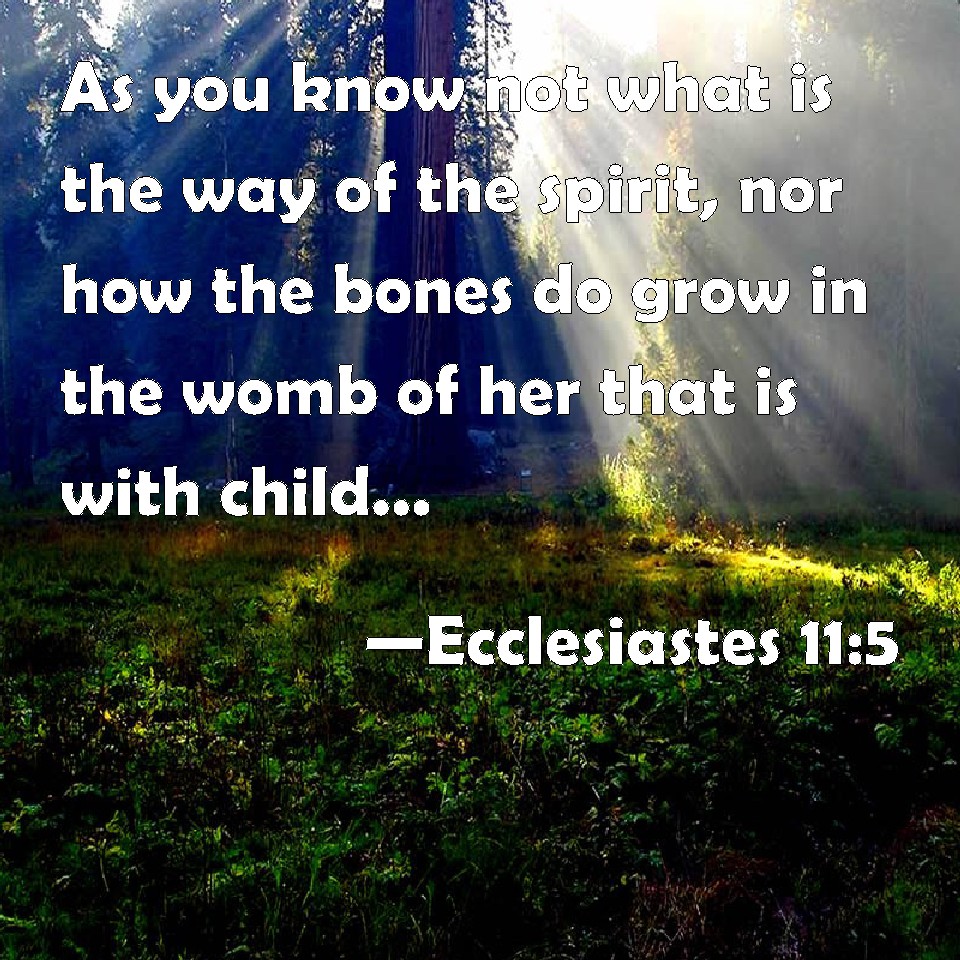 Choose a Background Ecclesiastes 11:5 As you know not what is the way of the spirit, nor how the bones do grow in the womb of her that is with child: even so you know not the works of God who makes all. KJV: As thou knowest not what is the way of the spirit, nor how the bones do grow in the womb of her that is with child: even so thou knowest not the works of God who maketh all. DRB: As thou knowest not what is the way of the spirit, nor how the bones are joined together in the womb of her that is with child: so thou knowest not the works of God, who is the maker of all. DBT: As thou knowest not what is the way of the spirit, how the bones grow in the womb of her that is with child, even so thou knowest not the work of God who maketh all. ERV: As thou knowest not what is the way of the wind, nor how the bones do grow in the womb of her that is with child; even so thou knowest not the work of God who doeth all. WBT: As thou knowest not what is the way of the spirit, nor the structure of the parts of conception in her that is with child: even so thou knowest not the works of God who maketh all. WEB: As you don't know what is the way of the wind, nor how the bones grow in the womb of her who is with child; even so you don't know the work of God who does all. YLT: As thou knowest not what is the way of the spirit, How — bones in the womb of the full one, So thou knowest not the work of God who maketh the whole.Links Ecclesiastes 11:5 NIV • Ecclesiastes 11:5 NLT • Ecclesiastes 11:5 ESV • Ecclesiastes 11:5 NASB • Ecclesiastes 11:5 KJV • Ecclesiastes 11:5 Interlinear • Ecclesiastes 11:5 Commentaries • Ecclesiastes 11:5 Parallel Texts • Ecclesiastes 11:5 Bible Apps • Ecclesiastes 11:5 Parallel • Bible Hub |