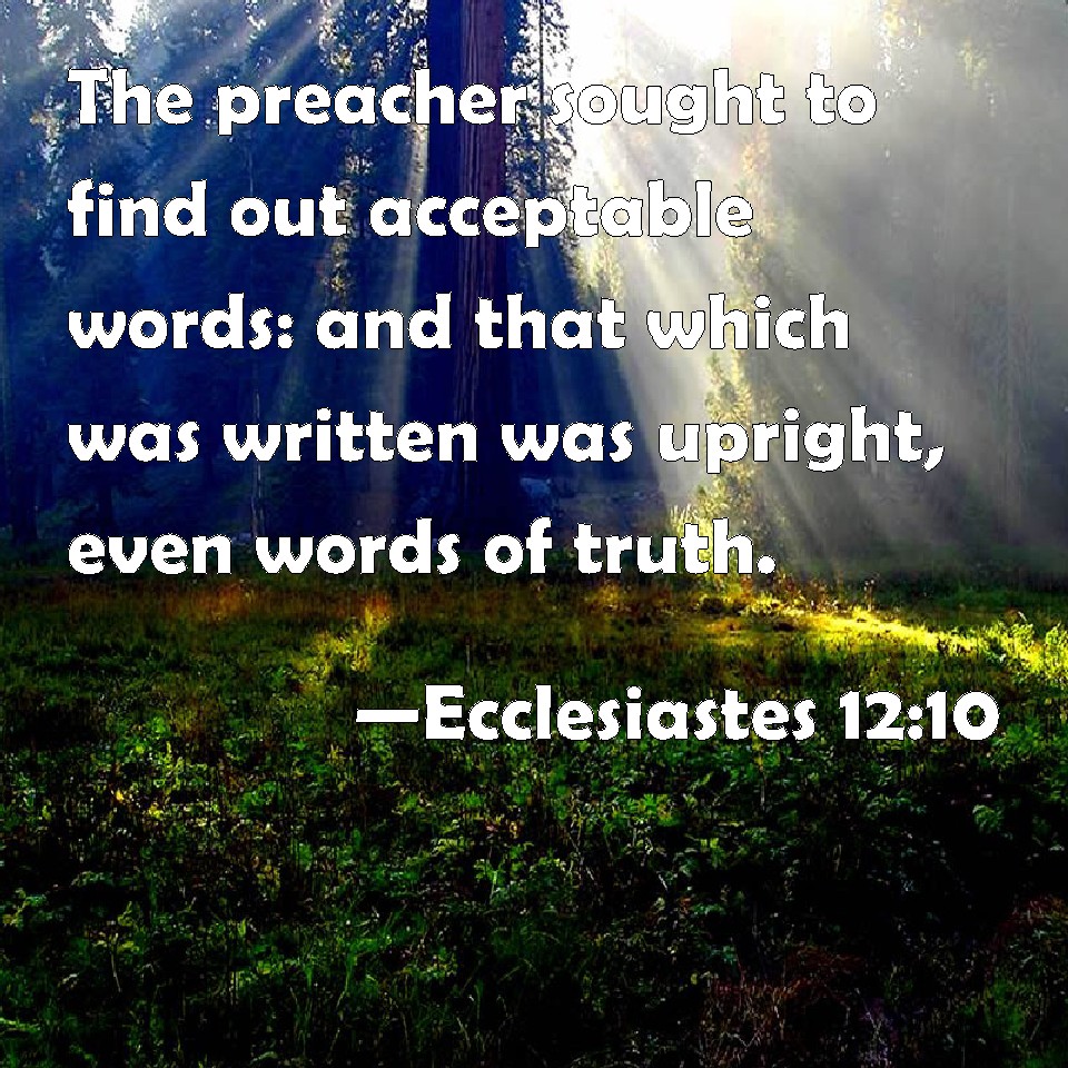 Choose a Background Ecclesiastes 12:10 The preacher sought to find out acceptable words: and that which was written was upright, even words of truth. KJV: The preacher sought to find out acceptable words: and that which was written was upright, even words of truth. DRB: He sought profitable words, and wrote words most right, and full of truth. DBT: The Preacher sought to find out acceptable words; and that which was written is upright, words of truth. ERV: The Preacher sought to find out acceptable words, and that which was written uprightly, even words of truth. WBT: The preacher sought to find out acceptable words: and that which was written was upright, even words of truth. WEB: The Preacher sought to find out acceptable words, and that which was written blamelessly, words of truth. YLT: The preacher sought to find out pleasing words, and, written by the upright, words of truth.Links Ecclesiastes 12:10 NIV • Ecclesiastes 12:10 NLT • Ecclesiastes 12:10 ESV • Ecclesiastes 12:10 NASB • Ecclesiastes 12:10 KJV • Ecclesiastes 12:10 Interlinear • Ecclesiastes 12:10 Commentaries • Ecclesiastes 12:10 Parallel Texts • Ecclesiastes 12:10 Bible Apps • Ecclesiastes 12:10 Parallel • Bible Hub |