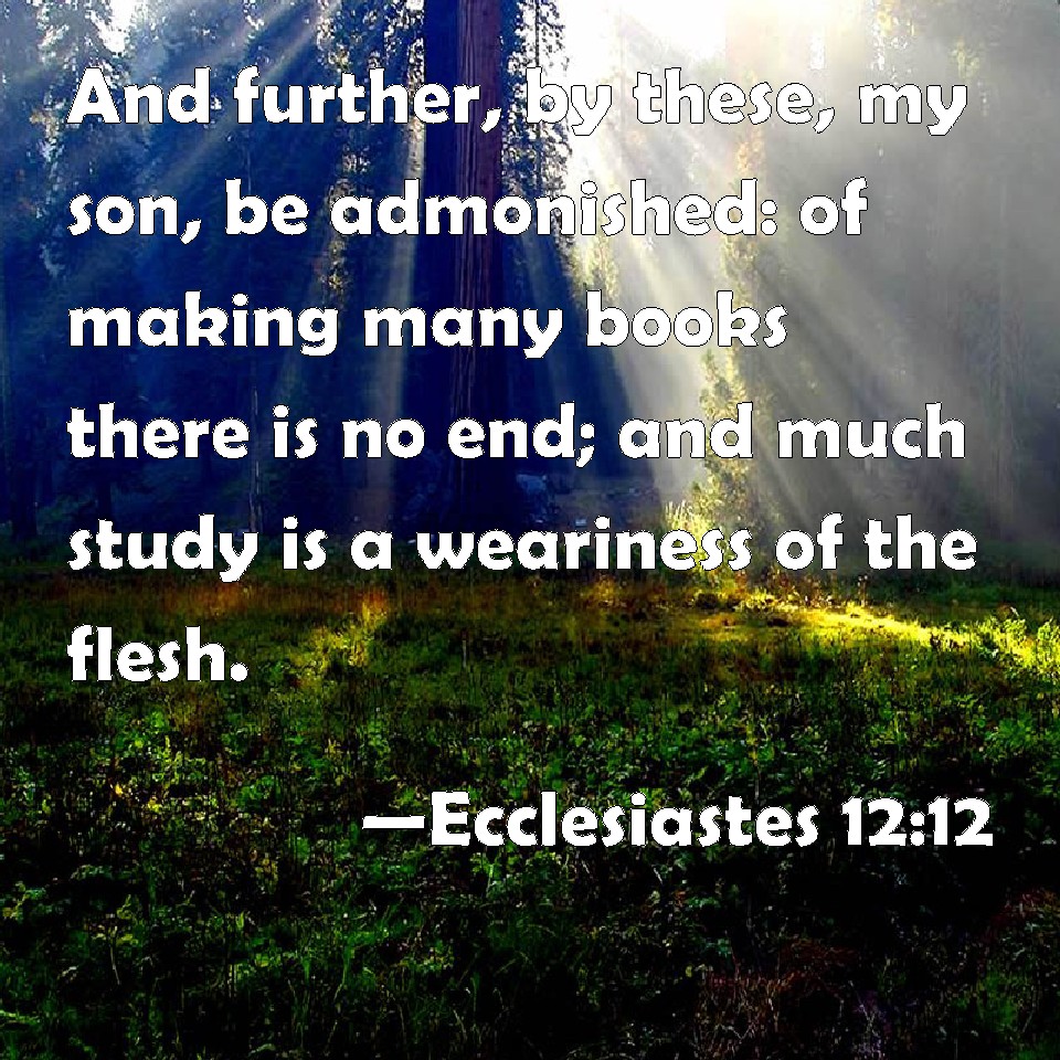 Choose a Background Ecclesiastes 12:12 And further, by these, my son, be admonished: of making many books there is no end; and much study is a weariness of the flesh. KJV: And further, by these, my son, be admonished: of making many books there is no end; and much study is a weariness of the flesh. DRB: More than these, my son, require not. Of making many books there is no end: and much study is an affliction of the flesh. DBT: And besides, my son, be warned by them: of making many books there is no end, and much study is a weariness of the flesh. ERV: And furthermore, my son, be admonished: of making many books there is no end; and much study is a weariness of the flesh. WBT: And further, by these, my son, be admonished: of making many books there is no end; and much study is a weariness of the flesh. WEB: Furthermore, my son, be admonished: of making many books there is no end; and much study is a weariness of the flesh. YLT: And further, from these, my son, be warned; the making of many books hath no end, and much study is a weariness of the flesh.Links Ecclesiastes 12:12 NIV • Ecclesiastes 12:12 NLT • Ecclesiastes 12:12 ESV • Ecclesiastes 12:12 NASB • Ecclesiastes 12:12 KJV • Ecclesiastes 12:12 Interlinear • Ecclesiastes 12:12 Commentaries • Ecclesiastes 12:12 Parallel Texts • Ecclesiastes 12:12 Bible Apps • Ecclesiastes 12:12 Parallel • Bible Hub |