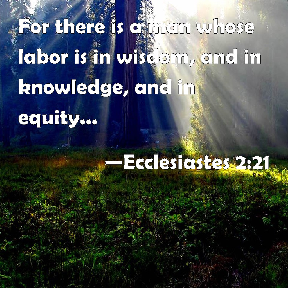 Choose a Background Ecclesiastes 2:21 For there is a man whose labor is in wisdom, and in knowledge, and in equity; yet to a man that has not labored therein shall he leave it for his portion. This also is vanity and a great evil. KJV: For there is a man whose labour is in wisdom, and in knowledge, and in equity; yet to a man that hath not laboured therein shall he leave it for his portion. This also is vanity and a great evil. DRB: For when a man laboureth in wisdom, and knowledge, and carefulness, he leaveth what he hath gotten to an idle man: so this also is vanity, and a great evil. DBT: For there is a man whose labour hath been with wisdom, and with knowledge, and with skill, and who leaveth it to a man that hath not laboured therein, to be his portion. This also is vanity and a great evil. ERV: For there is a man whose labour is with wisdom, and with knowledge, and with skilfulness; yet to a man that hath not laboured therein shall he leave it for his portion. This also is vanity and a great evil. WBT: For there is a man whose labor is in wisdom, and in knowledge, and in equity; yet to a man that hath not labored in it, shall he leave it for his portion. This also is vanity and a great evil. WEB: For there is a man whose labor is with wisdom, with knowledge, and with skillfulness; yet he shall leave it for his portion to a man who has not labored for it. This also is vanity and a great evil. YLT: For there is a man whose labour is in wisdom, and in knowledge, and in equity, and to a man who hath not laboured therein he giveth it — his portion! Even this is vanity and a great evil.Links Ecclesiastes 2:21 NIV • Ecclesiastes 2:21 NLT • Ecclesiastes 2:21 ESV • Ecclesiastes 2:21 NASB • Ecclesiastes 2:21 KJV • Ecclesiastes 2:21 Interlinear • Ecclesiastes 2:21 Commentaries • Ecclesiastes 2:21 Parallel Texts • Ecclesiastes 2:21 Bible Apps • Ecclesiastes 2:21 Parallel • Bible Hub |