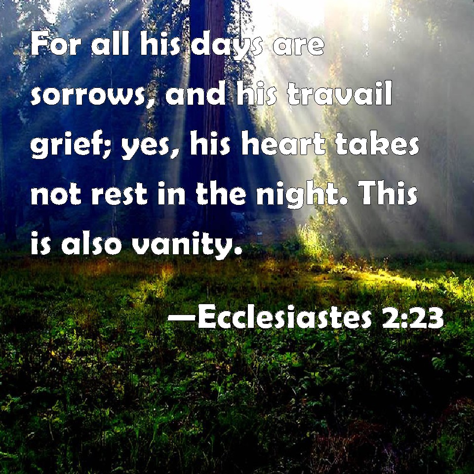 Choose a Background Ecclesiastes 2:23 For all his days are sorrows, and his travail grief; yes, his heart takes not rest in the night. This is also vanity. KJV: For all his days are sorrows, and his travail grief; yea, his heart taketh not rest in the night. This is also vanity. DRB: All his days axe full of sorrows and miseries, even in the night he doth not rest in mind: and is not this vanity? DBT: For all his days are sorrows, and his travail vexation: even in the night his heart taketh no rest. This also is vanity. ERV: For all his days are but sorrows, and his travail is grief; yea, even in the night his heart taketh no rest. This also is vanity. WBT: For all his days are sorrows, and his labor grief; yes, his heart taketh not rest in the night. This is also vanity. WEB: For all his days are sorrows, and his travail is grief; yes, even in the night his heart takes no rest. This also is vanity. YLT: For all his days are sorrows, and his travail sadness; even at night his heart hath not lain down; this also is vanity.Links Ecclesiastes 2:23 NIV • Ecclesiastes 2:23 NLT • Ecclesiastes 2:23 ESV • Ecclesiastes 2:23 NASB • Ecclesiastes 2:23 KJV • Ecclesiastes 2:23 Interlinear • Ecclesiastes 2:23 Commentaries • Ecclesiastes 2:23 Parallel Texts • Ecclesiastes 2:23 Bible Apps • Ecclesiastes 2:23 Parallel • Bible Hub |