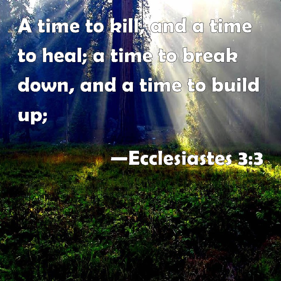 Choose a Background Ecclesiastes 3:3 A time to kill, and a time to heal; a time to break down, and a time to build up; KJV: A time to kill, and a time to heal; a time to break down, and a time to build up; DRB: A time to kill, and a time to heal. A time to destroy, and a time to build. DBT: A time to kill, and a time to heal; A time to break down, and a time to build up; ERV: a time to kill, and a time to heal; a time to break down, and a time to build up; WBT: A time to kill, and a time to heal; a time to break down, and a time to build up; WEB: a time to kill, and a time to heal; a time to break down, and a time to build up; YLT: A time to slay, And a time to heal, A time to break down, And a time to build up.Links Ecclesiastes 3:3 NIV • Ecclesiastes 3:3 NLT • Ecclesiastes 3:3 ESV • Ecclesiastes 3:3 NASB • Ecclesiastes 3:3 KJV • Ecclesiastes 3:3 Interlinear • Ecclesiastes 3:3 Commentaries • Ecclesiastes 3:3 Parallel Texts • Ecclesiastes 3:3 Bible Apps • Ecclesiastes 3:3 Parallel • Bible Hub |