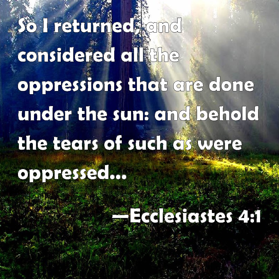 Choose a Background Ecclesiastes 4:1 So I returned, and considered all the oppressions that are done under the sun: and behold the tears of such as were oppressed, and they had no comforter; and on the side of their oppressors there was power; but they had no comforter. KJV: So I returned, and considered all the oppressions that are done under the sun: and behold the tears of such as were oppressed, and they had no comforter; and on the side of their oppressors there was power; but they had no comforter. DRB: I turned myself to other things, and I saw the oppressions that are done under the sun, and the tears of the innocent, and they had no comforter; and they were not able to resist their violence, being destitute of help from any. DBT: And I returned and saw all the oppressions that are done under the sun: and behold, the tears of the oppressed, and they had no comforter; and on the side of their oppressors was power, and they had no comforter. ERV: Then I returned and saw all the oppressions that are done under the sun: and behold, the tears of such as were oppressed, and they had no comforter; and on the side of their oppressors there was power, but they had no comforter. WBT: So I returned, and considered all the oppressions that are done under the sun: and behold the tears of such as were oppressed, and they had no comforter; and on the side of their oppressors there was power; but they had no comforter. WEB: Then I returned and saw all the oppressions that are done under the sun: and behold, the tears of those who were oppressed, and they had no comforter; and on the side of their oppressors there was power; but they had no comforter. YLT: And I have turned, and I see all the oppressions that are done under the sun, and lo, the tear of the oppressed, and they have no comforter; and at the hand of their oppressors is power, and they have no comforter.Links Ecclesiastes 4:1 NIV • Ecclesiastes 4:1 NLT • Ecclesiastes 4:1 ESV • Ecclesiastes 4:1 NASB • Ecclesiastes 4:1 KJV • Ecclesiastes 4:1 Interlinear • Ecclesiastes 4:1 Commentaries • Ecclesiastes 4:1 Parallel Texts • Ecclesiastes 4:1 Bible Apps • Ecclesiastes 4:1 Parallel • Bible Hub |