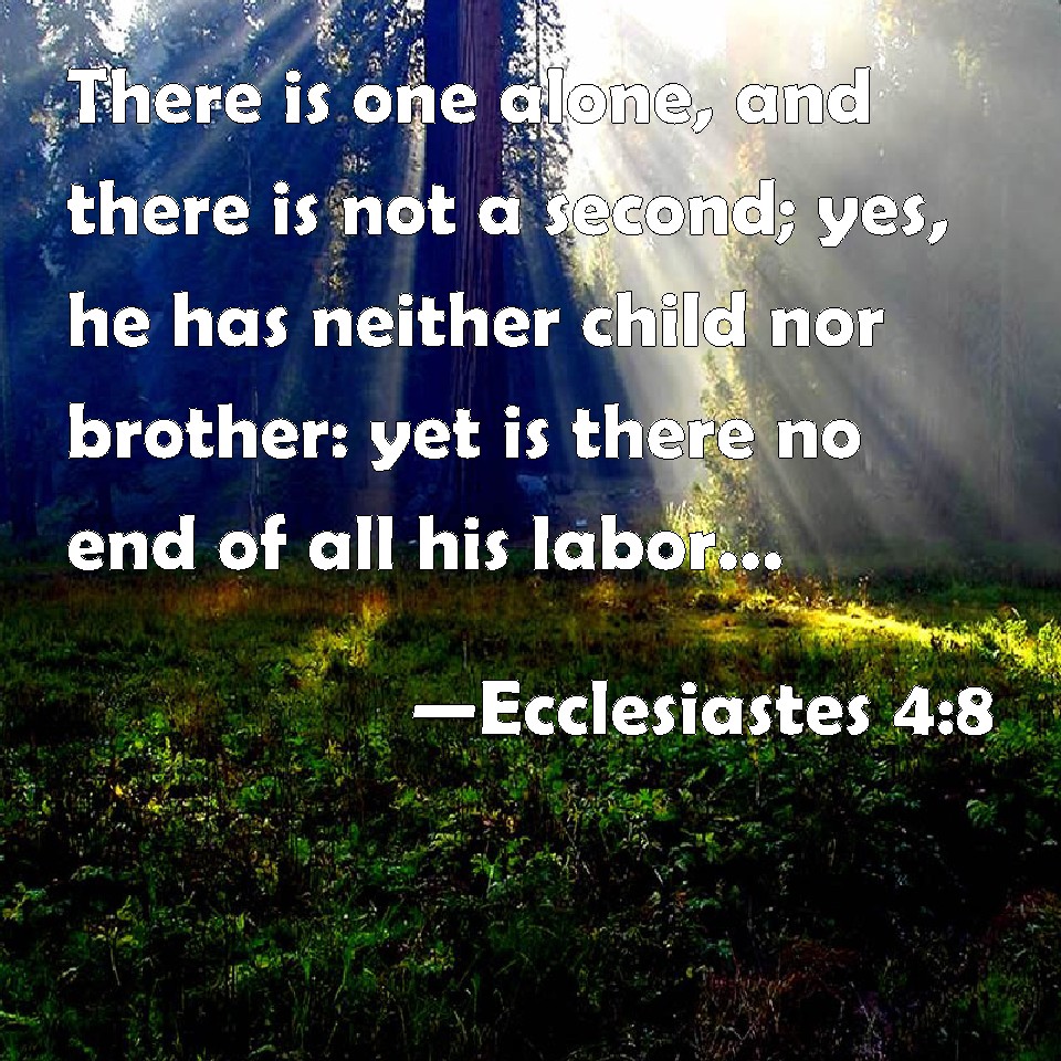 Choose a Background Ecclesiastes 4:8 There is one alone, and there is not a second; yes, he has neither child nor brother: yet is there no end of all his labor; neither is his eye satisfied with riches; neither said he, For whom do I labor, and bereave my soul of good? This is also vanity, yes, it is a sore travail. KJV: There is one alone, and there is not a second; yea, he hath neither child nor brother: yet is there no end of all his labour; neither is his eye satisfied with riches; neither saith he, For whom do I labour, and bereave my soul of good? This is also vanity, yea, it is a sore travail. DRB: There is but one, and he hath not a second, no child, no brother, and yet he ceaseth not to labour, neither are his eyes satisfied with riches, neither doth he reflect, saying: For whom do I labour, and defraud my soul of good things? in this also is vanity, and a grievous vexation. DBT: There is one alone and without a second; also he hath neither son nor brother: yet is there no end of all his labour, neither is his eye satisfied with riches, and he saith not, For whom then am I labouring, and depriving my soul of good? This also is vanity and a grievous occupation. ERV: There is one that is alone, and he hath not a second; yea, he hath neither son nor brother; yet is there no end of all his labour, neither are his eyes satisfied with riches. For whom then, saith he, do I labour, and deprive my soul of good? This also is vanity, yea, it is a sore travail. WBT: There is one alone, and there is not a second; yes, he hath neither child nor brother: yet is there no end of all his labor; neither is his eye satisfied with riches; neither saith he, For whom do I labor, and bereave my soul of good? This is also vanity, yes, it is a grievous labor. WEB: There is one who is alone, and he has neither son nor brother. There is no end to all of his labor, neither are his eyes satisfied with wealth. "For whom then, do I labor, and deprive my soul of enjoyment?" This also is vanity. Yes, it is a miserable business. YLT: There is one, and there is not a second; even son or brother he hath not, and there is no end to all his labour! His eye also is not satisfied with riches, and he saith not, 'For whom am I labouring and bereaving my soul of good?' This also is vanity, it is a sad travail.Links Ecclesiastes 4:8 NIV • Ecclesiastes 4:8 NLT • Ecclesiastes 4:8 ESV • Ecclesiastes 4:8 NASB • Ecclesiastes 4:8 KJV • Ecclesiastes 4:8 Interlinear • Ecclesiastes 4:8 Commentaries • Ecclesiastes 4:8 Parallel Texts • Ecclesiastes 4:8 Bible Apps • Ecclesiastes 4:8 Parallel • Bible Hub |