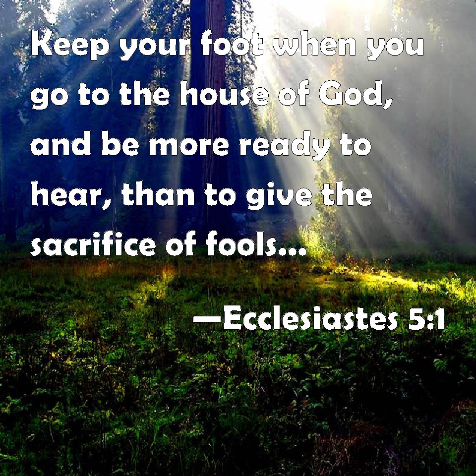 Choose a Background Ecclesiastes 5:1 Keep your foot when you go to the house of God, and be more ready to hear, than to give the sacrifice of fools: for they consider not that they do evil. KJV: Keep thy foot when thou goest to the house of God, and be more ready to hear, than to give the sacrifice of fools: for they consider not that they do evil. DRB: Keep thy foot, when thou goest into the house of God, and draw nigh to hear. For much better is obedience, than the victims of fools, who know not what evil they do. DBT: Keep thy foot when thou goest to the house of God, and draw near to hear, rather than to give the sacrifice of fools: for they know not that they do evil. ERV: Keep thy foot when thou goest to the house of God; for to draw nigh to hear is better than to give the sacrifice of fools: for they know not that they do evil. WBT: Keep thy foot when thou goest to the house of God, and be more ready to hear, than to give the sacrifice of fools: for they consider not that they do evil. WEB: Guard your steps when you go to God's house; for to draw near to listen is better than to give the sacrifice of fools, for they don't know that they do evil. YLT: Keep thy feet when thou goest unto a house of God, and draw near to hear rather than to give of fools the sacrifice, for they do not know they do evil.Links Ecclesiastes 5:1 NIV • Ecclesiastes 5:1 NLT • Ecclesiastes 5:1 ESV • Ecclesiastes 5:1 NASB • Ecclesiastes 5:1 KJV • Ecclesiastes 5:1 Interlinear • Ecclesiastes 5:1 Commentaries • Ecclesiastes 5:1 Parallel Texts • Ecclesiastes 5:1 Bible Apps • Ecclesiastes 5:1 Parallel • Bible Hub |
