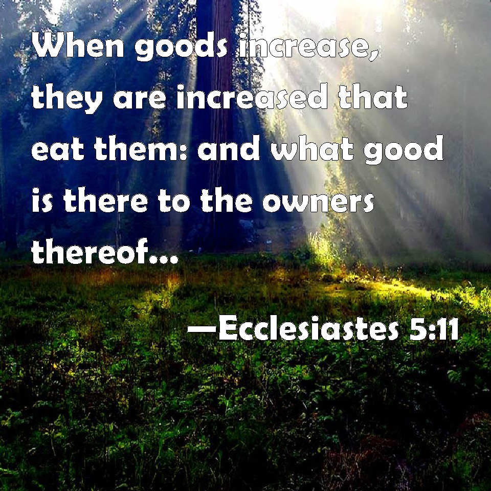 Choose a Background Ecclesiastes 5:11 When goods increase, they are increased that eat them: and what good is there to the owners thereof, saving the beholding of them with their eyes? KJV: When goods increase, they are increased that eat them: and what good is there to the owners thereof, saving the beholding of them with their eyes? DRB: Where there are great riches, there are also many to eat them. And what doth it profit the owner, but that he seeth the riches with his eyes? DBT: When goods increase, they are increased that eat them; and what profit is there to the owner thereof, except the beholding of them with his eyes? ERV: When goods increase, they are increased that eat them: and what advantage is there to the owner thereof, saving the beholding of them with his eyes? WBT: When goods increase, they are increased that eat them: and what good is there to the owners of them, saving the beholding of them with their eyes? WEB: When goods increase, those who eat them are increased; and what advantage is there to its owner, except to feast on them with his eyes? YLT: In the multiplying of good have its consumers been multiplied, and what benefit is to its possessor except the sight of his eyes?Links Ecclesiastes 5:11 NIV • Ecclesiastes 5:11 NLT • Ecclesiastes 5:11 ESV • Ecclesiastes 5:11 NASB • Ecclesiastes 5:11 KJV • Ecclesiastes 5:11 Interlinear • Ecclesiastes 5:11 Commentaries • Ecclesiastes 5:11 Parallel Texts • Ecclesiastes 5:11 Bible Apps • Ecclesiastes 5:11 Parallel • Bible Hub |