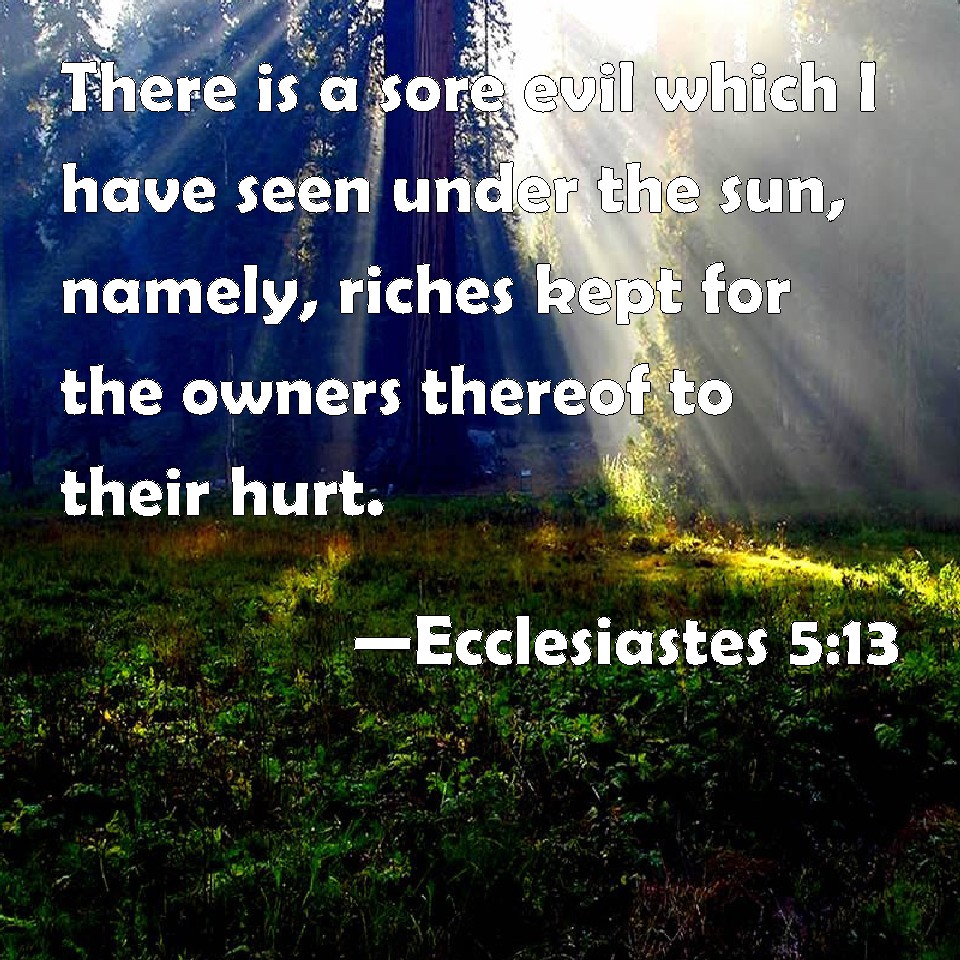 Choose a Background Ecclesiastes 5:13 There is a sore evil which I have seen under the sun, namely, riches kept for the owners thereof to their hurt. KJV: There is a sore evil which I have seen under the sun, namely, riches kept for the owners thereof to their hurt. DRB: There is also another grievous evil, which I have seen under the sun: riches kept to the hurt of the owner. DBT: There is a grievous evil that I have seen under the sun: riches kept for the owners thereof to their hurt; ERV: There is a grievous evil, which I have seen under the sun, namely, riches kept by the owner thereof to his hurt: WBT: There is a grievous evil which I have seen under the sun, namely, riches kept for the owners of them to their hurt. WEB: There is a grievous evil which I have seen under the sun: wealth kept by its owner to his harm. YLT: There is a painful evil I have seen under the sun: wealth kept for its possessor, for his evil.Links Ecclesiastes 5:13 NIV • Ecclesiastes 5:13 NLT • Ecclesiastes 5:13 ESV • Ecclesiastes 5:13 NASB • Ecclesiastes 5:13 KJV • Ecclesiastes 5:13 Interlinear • Ecclesiastes 5:13 Commentaries • Ecclesiastes 5:13 Parallel Texts • Ecclesiastes 5:13 Bible Apps • Ecclesiastes 5:13 Parallel • Bible Hub |
