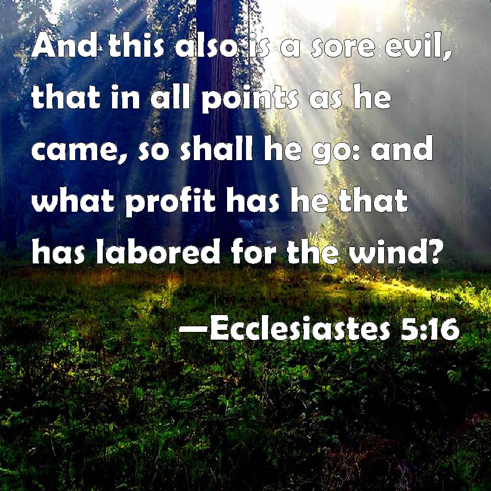 Choose a Background Ecclesiastes 5:16 And this also is a sore evil, that in all points as he came, so shall he go: and what profit has he that has labored for the wind? KJV: And this also is a sore evil, that in all points as he came, so shall he go: and what profit hath he that hath laboured for the wind? DRB: A most deplorable evil: as he came, so shall he return. What then doth it profit him that he hath laboured for the wind? DBT: And this also is a grievous evil, that in all points as he came so doth he go away, and what profit hath he, in having laboured for the wind? ERV: And this also is a grievous evil, that in all points as he came, so shall he go: and what profit hath he that he laboureth for the wind? WBT: And this also is a grievous evil, that in all points as he came, so shall he go: and what profit hath he that hath labored for the wind? WEB: This also is a grievous evil, that in all points as he came, so shall he go. And what profit does he have who labors for the wind? YLT: And this also is a painful evil, just as he came, so he goeth, and what advantage is to him who laboureth for wind?Links Ecclesiastes 5:16 NIV • Ecclesiastes 5:16 NLT • Ecclesiastes 5:16 ESV • Ecclesiastes 5:16 NASB • Ecclesiastes 5:16 KJV • Ecclesiastes 5:16 Interlinear • Ecclesiastes 5:16 Commentaries • Ecclesiastes 5:16 Parallel Texts • Ecclesiastes 5:16 Bible Apps • Ecclesiastes 5:16 Parallel • Bible Hub |