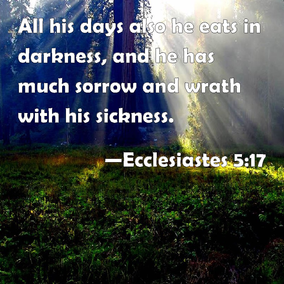 Choose a Background Ecclesiastes 5:17 All his days also he eats in darkness, and he has much sorrow and wrath with his sickness. KJV: All his days also he eateth in darkness, and he hath much sorrow and wrath with his sickness. DRB: All the days of his life he eateth in darkness, and in many cares, and in misery, and sorrow. DBT: All his days also he eateth in darkness, and hath much vexation, and sickness, and irritation. ERV: All his days also he eateth in darkness, and he is sore vexed and hath sickness and wrath. WBT: All his days also he eateth in darkness, and he hath much sorrow and wrath with his sickness. WEB: All his days he also eats in darkness, he is frustrated, and has sickness and wrath. YLT: Also all his days in darkness he consumeth, and sadness, and wrath, and sickness abound.Links Ecclesiastes 5:17 NIV • Ecclesiastes 5:17 NLT • Ecclesiastes 5:17 ESV • Ecclesiastes 5:17 NASB • Ecclesiastes 5:17 KJV • Ecclesiastes 5:17 Interlinear • Ecclesiastes 5:17 Commentaries • Ecclesiastes 5:17 Parallel Texts • Ecclesiastes 5:17 Bible Apps • Ecclesiastes 5:17 Parallel • Bible Hub |