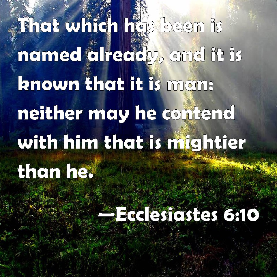 Choose a Background Ecclesiastes 6:10 That which has been is named already, and it is known that it is man: neither may he contend with him that is mightier than he. KJV: That which hath been is named already, and it is known that it is man: neither may he contend with him that is mightier than he. DRB: He that shall be, his name is already called: and it is known, that he is man, and cannot contend in judgment with him that is stronger than himself. DBT: That which is hath already been named; and what man is, is known, and that he cannot contend with him that is mightier than he. ERV: Whatsoever hath been, the name thereof was given long ago, and it is known that it is man: neither can he contend with him that is mightier than he. WBT: That which hath been is named already, and it is known that it is man: neither may he contend with him that is mightier than he. WEB: Whatever has been, its name was given long ago; and it is known what man is; neither can he contend with him who is mightier than he. YLT: What is that which hath been? already is its name called, and it is known that it is man, and he is not able to contend with him who is stronger than he.Links Ecclesiastes 6:10 NIV • Ecclesiastes 6:10 NLT • Ecclesiastes 6:10 ESV • Ecclesiastes 6:10 NASB • Ecclesiastes 6:10 KJV • Ecclesiastes 6:10 Interlinear • Ecclesiastes 6:10 Commentaries • Ecclesiastes 6:10 Parallel Texts • Ecclesiastes 6:10 Bible Apps • Ecclesiastes 6:10 Parallel • Bible Hub |