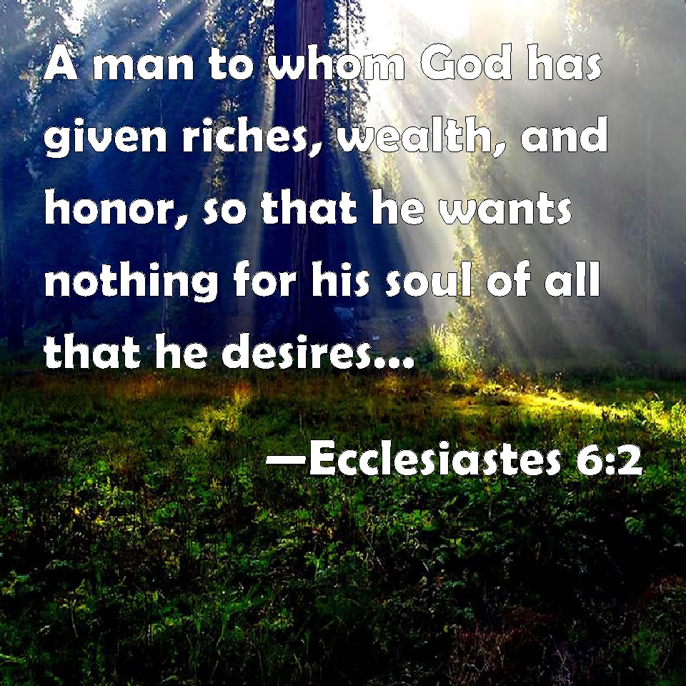 Choose a Background Ecclesiastes 6:2 A man to whom God has given riches, wealth, and honor, so that he wants nothing for his soul of all that he desires, yet God gives him not power to eat thereof, but a stranger eats it: this is vanity, and it is an evil disease. KJV: A man to whom God hath given riches, wealth, and honour, so that he wanteth nothing for his soul of all that he desireth, yet God giveth him not power to eat thereof, but a stranger eateth it: this is vanity, and it is an evil disease. DRB: A man to whom God hath given riches, and substance, and honour, and his soul wanteth nothing of all that he desireth: yet God doth not give him power to eat thereof, but a stranger shall eat it up. This is vanity and a great misery. DBT: one to whom God giveth riches, wealth, and honour, and he wanteth nothing for his soul of all that he desireth, yet God giveth him not power to eat thereof, but a stranger eateth it: this is vanity, and a sore evil. ERV: a man to whom God giveth riches, wealth, and honour, so that he lacketh nothing for his soul of all that he desireth, yet God giveth him not power to eat thereof, but a stranger eateth it; this is vanity, and it is an evil disease. WBT: A man to whom God hath given riches, wealth, and honor, so that he wanteth nothing for his soul of all that he desireth, yet God giveth him not power to eat of it, but a stranger eateth it: this is vanity, and it is an evil disease. WEB: a man to whom God gives riches, wealth, and honor, so that he lacks nothing for his soul of all that he desires, yet God gives him no power to eat of it, but an alien eats it. This is vanity, and it is an evil disease. YLT: A man to whom God giveth wealth, and riches, and honour, and there is no lack to his soul of all that he desireth, and God giveth him not power to eat of it, but a stranger eateth it; this is vanity, and it is an evil disease.Links Ecclesiastes 6:2 NIV • Ecclesiastes 6:2 NLT • Ecclesiastes 6:2 ESV • Ecclesiastes 6:2 NASB • Ecclesiastes 6:2 KJV • Ecclesiastes 6:2 Interlinear • Ecclesiastes 6:2 Commentaries • Ecclesiastes 6:2 Parallel Texts • Ecclesiastes 6:2 Bible Apps • Ecclesiastes 6:2 Parallel • Bible Hub |
