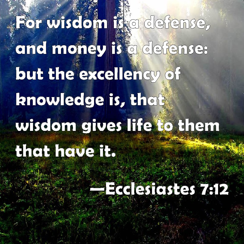 Choose a Background Ecclesiastes 7:12 For wisdom is a defense, and money is a defense: but the excellency of knowledge is, that wisdom gives life to them that have it. KJV: For wisdom is a defence, and money is a defence: but the excellency of knowledge is, that wisdom giveth life to them that have it. DRB: For as wisdom is a defence, so money is a defence : but learning and wisdom excel in this, that they give life to him that possesseth them. DBT: For wisdom is a defence as money is a defence; but the excellency of knowledge is, that wisdom maketh them that possess it to live. ERV: For wisdom is a defence, even as money is a defence: but the excellency of knowledge is, that wisdom preserveth the life of him that hath it. WBT: For wisdom is a defense, and money is a defense: but the excellence of knowledge is, that wisdom giveth life to them that have it. WEB: For wisdom is a defense, even as money is a defense; but the excellency of knowledge is that wisdom preserves the life of him who has it. YLT: For wisdom is a defense, money is a defence, And the advantage of the knowledge of wisdom is, She reviveth her possessors.Links Ecclesiastes 7:12 NIV • Ecclesiastes 7:12 NLT • Ecclesiastes 7:12 ESV • Ecclesiastes 7:12 NASB • Ecclesiastes 7:12 KJV • Ecclesiastes 7:12 Interlinear • Ecclesiastes 7:12 Commentaries • Ecclesiastes 7:12 Parallel Texts • Ecclesiastes 7:12 Bible Apps • Ecclesiastes 7:12 Parallel • Bible Hub |