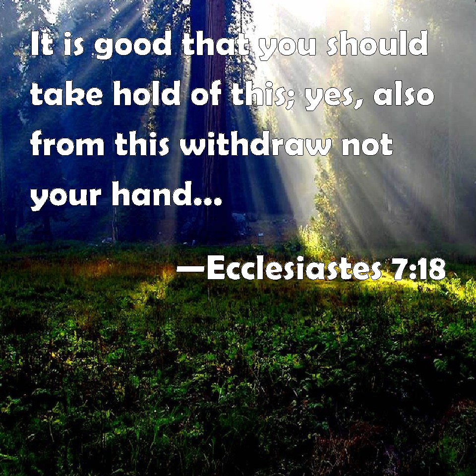 Choose a Background Ecclesiastes 7:18 It is good that you should take hold of this; yes, also from this withdraw not your hand: for he that fears God shall come forth of them all. KJV: It is good that thou shouldest take hold of this; yea, also from this withdraw not thine hand: for he that feareth God shall come forth of them all. DRB: It is good that thou shouldst hold up the just, yea and from him withdraw not thy hand: for he that feareth God, neglecteth nothing. DBT: It is good that thou shouldest take hold of this; yea, also from that withdraw not thy hand: for he that feareth God cometh forth from them all. ERV: It is good that thou shouldest take hold of this; yea, also from that withdraw not thine hand: for he that feareth God shall come forth of them all. WBT: It is good that thou shouldst take hold of this; yes, also from this withdraw not thy hand: for he that feareth God shall escape from them all. WEB: It is good that you should take hold of this. Yes, also from that don't withdraw your hand; for he who fears God will come forth from them all. YLT: It is good that thou dost lay hold on this, and also, from that withdrawest not thy hand, for whoso is fearing God goeth out with them all.Links Ecclesiastes 7:18 NIV • Ecclesiastes 7:18 NLT • Ecclesiastes 7:18 ESV • Ecclesiastes 7:18 NASB • Ecclesiastes 7:18 KJV • Ecclesiastes 7:18 Interlinear • Ecclesiastes 7:18 Commentaries • Ecclesiastes 7:18 Parallel Texts • Ecclesiastes 7:18 Bible Apps • Ecclesiastes 7:18 Parallel • Bible Hub |