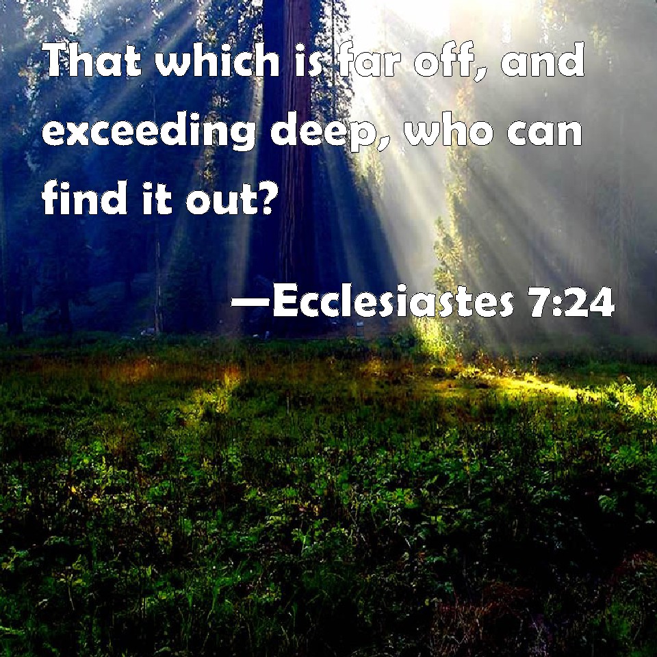 Choose a Background Ecclesiastes 7:24 That which is far off, and exceeding deep, who can find it out? KJV: That which is far off, and exceeding deep, who can find it out? DRB: Much more than it was: it is a great depth, who shall find it out? DBT: Whatever hath been, is far off, and exceeding deep: who will find it out? ERV: That which is is far off, and exceeding deep; who can find it out? WBT: That which is far off, and exceedingly deep, who can find it out? WEB: That which is, is far off and exceedingly deep. Who can find it out? YLT: Far off is that which hath been, and deep, deep, who doth find it?Links Ecclesiastes 7:24 NIV • Ecclesiastes 7:24 NLT • Ecclesiastes 7:24 ESV • Ecclesiastes 7:24 NASB • Ecclesiastes 7:24 KJV • Ecclesiastes 7:24 Interlinear • Ecclesiastes 7:24 Commentaries • Ecclesiastes 7:24 Parallel Texts • Ecclesiastes 7:24 Bible Apps • Ecclesiastes 7:24 Parallel • Bible Hub |