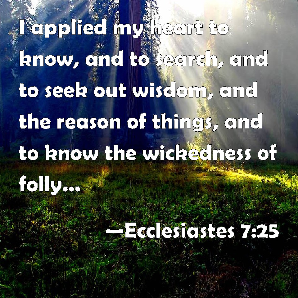 Ecclesiastes 7:25 I applied my heart to know, and to search, and to seek out wisdom, and the reason of things, and to know the wickedness of folly, even of foolishness and madness: