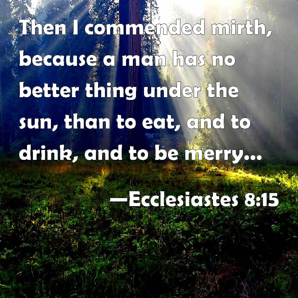 Choose a Background Ecclesiastes 8:15 Then I commended mirth, because a man has no better thing under the sun, than to eat, and to drink, and to be merry: for that shall abide with him of his labor the days of his life, which God gives him under the sun. KJV: Then I commended mirth, because a man hath no better thing under the sun, than to eat, and to drink, and to be merry: for that shall abide with him of his labour the days of his life, which God giveth him under the sun. DRB: Therefore I commended mirth, because there was no good for a man under the sun, but to eat, and drink, and be merry, and that he should take nothing else with him of his labour in the days of his life, which God hath given him under the sun. DBT: And I commended mirth, because there is nothing better for man under the sun than to eat, and to drink, and to be merry; for that shall abide with him of his labour the days of his life, which God hath given him under the sun. ERV: Then I commended mirth, because a man hath no better thing under the sun, than to eat, and to drink, and to be merry: for that shall abide with him in his labour all the days of his life which God hath given him under the sun. WBT: Then I commended mirth, because a man hath no better thing under the sun, than to eat, and to drink, and to be merry: for that shall abide with him of his labor the days of his life, which God giveth him under the sun. WEB: Then I commended mirth, because a man has no better thing under the sun, than to eat, and to drink, and to be joyful: for that will accompany him in his labor all the days of his life which God has given him under the sun. YLT: And I have praised mirth because there is no good to man under the sun except to eat and to drink, and to rejoice, and it remaineth with him of his labour the days of his life that God hath given to him under the sun.Links Ecclesiastes 8:15 NIV • Ecclesiastes 8:15 NLT • Ecclesiastes 8:15 ESV • Ecclesiastes 8:15 NASB • Ecclesiastes 8:15 KJV • Ecclesiastes 8:15 Interlinear • Ecclesiastes 8:15 Commentaries • Ecclesiastes 8:15 Parallel Texts • Ecclesiastes 8:15 Bible Apps • Ecclesiastes 8:15 Parallel • Bible Hub |