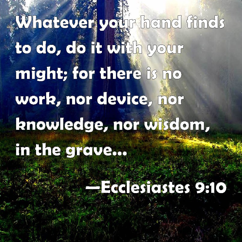 Choose a Background Ecclesiastes 9:10 Whatever your hand finds to do, do it with your might; for there is no work, nor device, nor knowledge, nor wisdom, in the grave, where you go. KJV: Whatsoever thy hand findeth to do, do it with thy might; for there is no work, nor device, nor knowledge, nor wisdom, in the grave, whither thou goest. DRB: Whatsoever thy hand is able to do, do it earnestly: for neither work, nor reason, nor wisdom, nor knowledge shall be in hell, whither thou art hastening. DBT: Whatever thy hand findeth to do, do with thy might; for there is no work, nor device, nor knowledge, nor wisdom, in Sheol, whither thou goest. ERV: Whatsoever thy hand findeth to do, do it with thy might; for there is no work, nor device, nor knowledge, nor wisdom, in the grave, whither thou goest. WBT: Whatever thy hand findeth to do, do it with thy might; for there is no work, nor device, nor knowledge, nor wisdom, in the grave, whither thou goest. WEB: Whatever your hand finds to do, do it with your might; for there is no work, nor device, nor knowledge, nor wisdom, in Sheol, where you are going. YLT: All that thy hand findeth to do, with thy power do, for there is no work, and device, and knowledge, and wisdom in Sheol whither thou art going.Links Ecclesiastes 9:10 NIV • Ecclesiastes 9:10 NLT • Ecclesiastes 9:10 ESV • Ecclesiastes 9:10 NASB • Ecclesiastes 9:10 KJV • Ecclesiastes 9:10 Interlinear • Ecclesiastes 9:10 Commentaries • Ecclesiastes 9:10 Parallel Texts • Ecclesiastes 9:10 Bible Apps • Ecclesiastes 9:10 Parallel • Bible Hub |