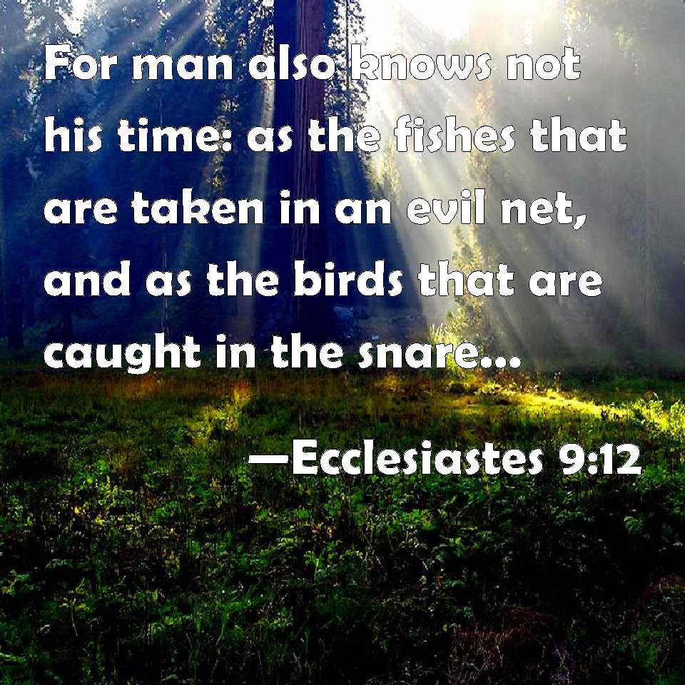 Choose a Background Ecclesiastes 9:12 For man also knows not his time: as the fishes that are taken in an evil net, and as the birds that are caught in the snare; so are the sons of men snared in an evil time, when it falls suddenly on them. KJV: For man also knoweth not his time: as the fishes that are taken in an evil net, and as the birds that are caught in the snare; so are the sons of men snared in an evil time, when it falleth suddenly upon them. DRB: Man knoweth not his own end: but as fishes are taken with the hook, and as birds are caught with the snare, so men are taken in the evil time, when it shall suddenly come upon them. DBT: For man also knoweth not his time: as the fishes that are taken in an evil net, and as the birds that are taken with the snare, like them are the children of men snared in an evil time, when it falleth suddenly upon them. ERV: For man also knoweth not his time: as the fishes that are taken in an evil net, and as the birds that are caught in the snare, even so, are the sons of men snared in an evil time, when it falleth suddenly upon them. WBT: For man also knoweth not his time: as the fishes that are taken in an evil net, and as the birds that are caught in the snare; so are the sons of men snared in an evil time, when it falleth suddenly upon them. WEB: For man also doesn't know his time. As the fish that are taken in an evil net, and as the birds that are caught in the snare, even so are the sons of men snared in an evil time, when it falls suddenly on them. YLT: For even man knoweth not his time; as fish that are taken hold of by an evil net, and as birds that are taken hold of by a snare, like these are the sons of man snared at an evil time, when it falleth upon them suddenly.Links Ecclesiastes 9:12 NIV • Ecclesiastes 9:12 NLT • Ecclesiastes 9:12 ESV • Ecclesiastes 9:12 NASB • Ecclesiastes 9:12 KJV • Ecclesiastes 9:12 Interlinear • Ecclesiastes 9:12 Commentaries • Ecclesiastes 9:12 Parallel Texts • Ecclesiastes 9:12 Bible Apps • Ecclesiastes 9:12 Parallel • Bible Hub |