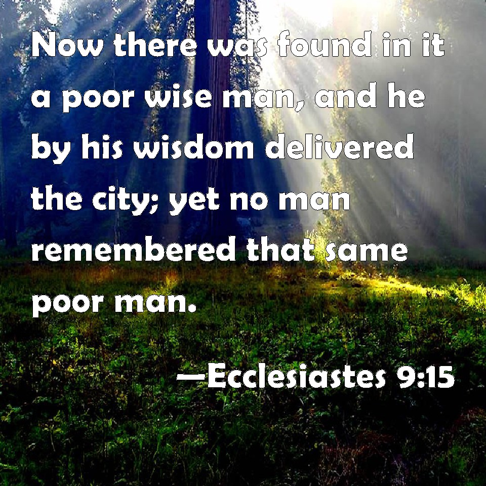 Choose a Background Ecclesiastes 9:15 Now there was found in it a poor wise man, and he by his wisdom delivered the city; yet no man remembered that same poor man. KJV: Now there was found in it a poor wise man, and he by his wisdom delivered the city; yet no man remembered that same poor man. DRB: Now there was found in it a man poor and wise, and he delivered the city by his wisdom, and no man afterward remembered that poor man. DBT: and there was found in it a poor wise man, who by his wisdom delivered the city; but no man remembered that poor man. ERV: Now there was found in it a poor wise man, and he by his wisdom delivered the city; yet no man remembered that same poor man. WBT: Now there was found in it a poor wise man, and he by his wisdom delivered the city; yet no man remembered that same poor man. WEB: Now a poor wise man was found in it, and he by his wisdom delivered the city; yet no man remembered that same poor man. YLT: and there hath been found in it a poor wise man, and he hath delivered the city by his wisdom, and men have not remembered that poor man!Links Ecclesiastes 9:15 NIV • Ecclesiastes 9:15 NLT • Ecclesiastes 9:15 ESV • Ecclesiastes 9:15 NASB • Ecclesiastes 9:15 KJV • Ecclesiastes 9:15 Interlinear • Ecclesiastes 9:15 Commentaries • Ecclesiastes 9:15 Parallel Texts • Ecclesiastes 9:15 Bible Apps • Ecclesiastes 9:15 Parallel • Bible Hub |