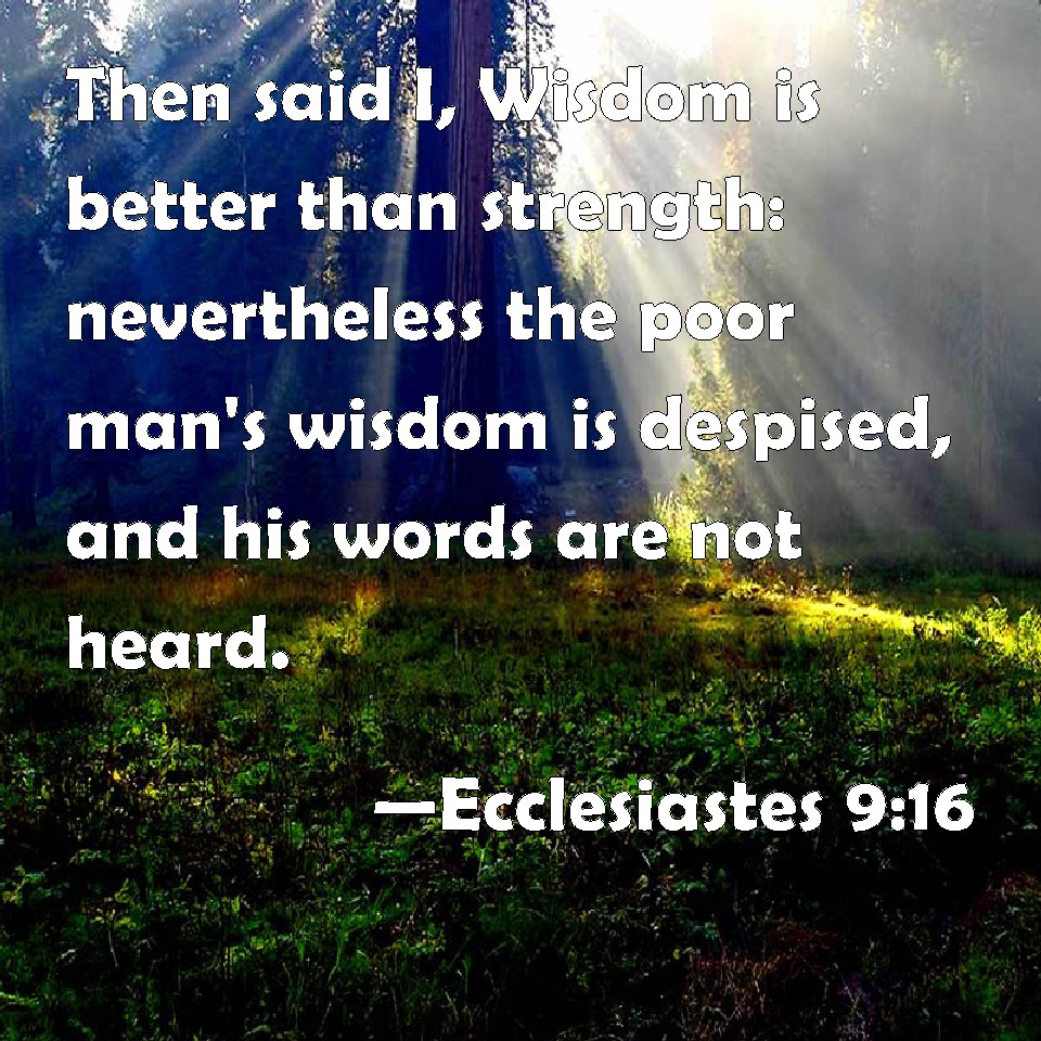 Choose a Background Ecclesiastes 9:16 Then said I, Wisdom is better than strength: nevertheless the poor man's wisdom is despised, and his words are not heard. KJV: Then said I, Wisdom is better than strength: nevertheless the poor man's wisdom is despised, and his words are not heard. DRB: And I said that wisdom is better than strength: how then is the wisdom of the poor man slighted, and his words not heard? DBT: Then said I, Wisdom is better than strength; but the poor man's wisdom is despised, and his words are not heard. ERV: Then said I, Wisdom is better than strength: nevertheless the poor man's wisdom is despised, and his words are not heard. WBT: Then said I, wisdom is better than strength: nevertheless the poor man's wisdom is despised, and his words are not heard. WEB: Then I said, "Wisdom is better than strength." Nevertheless the poor man's wisdom is despised, and his words are not heard. YLT: And I said, 'Better is wisdom than might, and the wisdom of the poor is despised, and his words are not heard.' — Links Ecclesiastes 9:16 NIV • Ecclesiastes 9:16 NLT • Ecclesiastes 9:16 ESV • Ecclesiastes 9:16 NASB • Ecclesiastes 9:16 KJV • Ecclesiastes 9:16 Interlinear • Ecclesiastes 9:16 Commentaries • Ecclesiastes 9:16 Parallel Texts • Ecclesiastes 9:16 Bible Apps • Ecclesiastes 9:16 Parallel • Bible Hub |