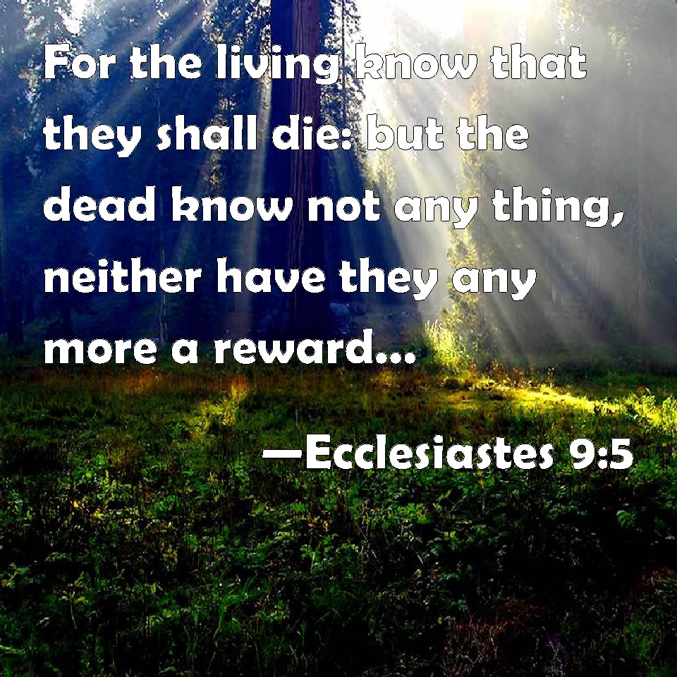 Choose a Background Ecclesiastes 9:5 For the living know that they shall die: but the dead know not any thing, neither have they any more a reward; for the memory of them is forgotten. KJV: For the living know that they shall die: but the dead know not any thing, neither have they any more a reward; for the memory of them is forgotten. DRB: For the living know that they shall die, but the dead know nothing more, neither have they a reward any more: for the memory of them is forgotten. DBT: For the living know that they shall die; but the dead know not anything, neither have they any more a reward, for the memory of them is forgotten. ERV: For the living know that they shall die: but the dead know not any thing, neither have they any more a reward; for the memory of them is forgotten. WBT: For the living know that they shall die: but the dead know not any thing, neither have they any more a reward; for the memory of them is forgotten. WEB: For the living know that they will die, but the dead don't know anything, neither do they have any more a reward; for the memory of them is forgotten. YLT: For the living know that they die, and the dead know not anything, and there is no more to them a reward, for their remembrance hath been forgotten.Links Ecclesiastes 9:5 NIV • Ecclesiastes 9:5 NLT • Ecclesiastes 9:5 ESV • Ecclesiastes 9:5 NASB • Ecclesiastes 9:5 KJV • Ecclesiastes 9:5 Interlinear • Ecclesiastes 9:5 Commentaries • Ecclesiastes 9:5 Parallel Texts • Ecclesiastes 9:5 Bible Apps • Ecclesiastes 9:5 Parallel • Bible Hub |