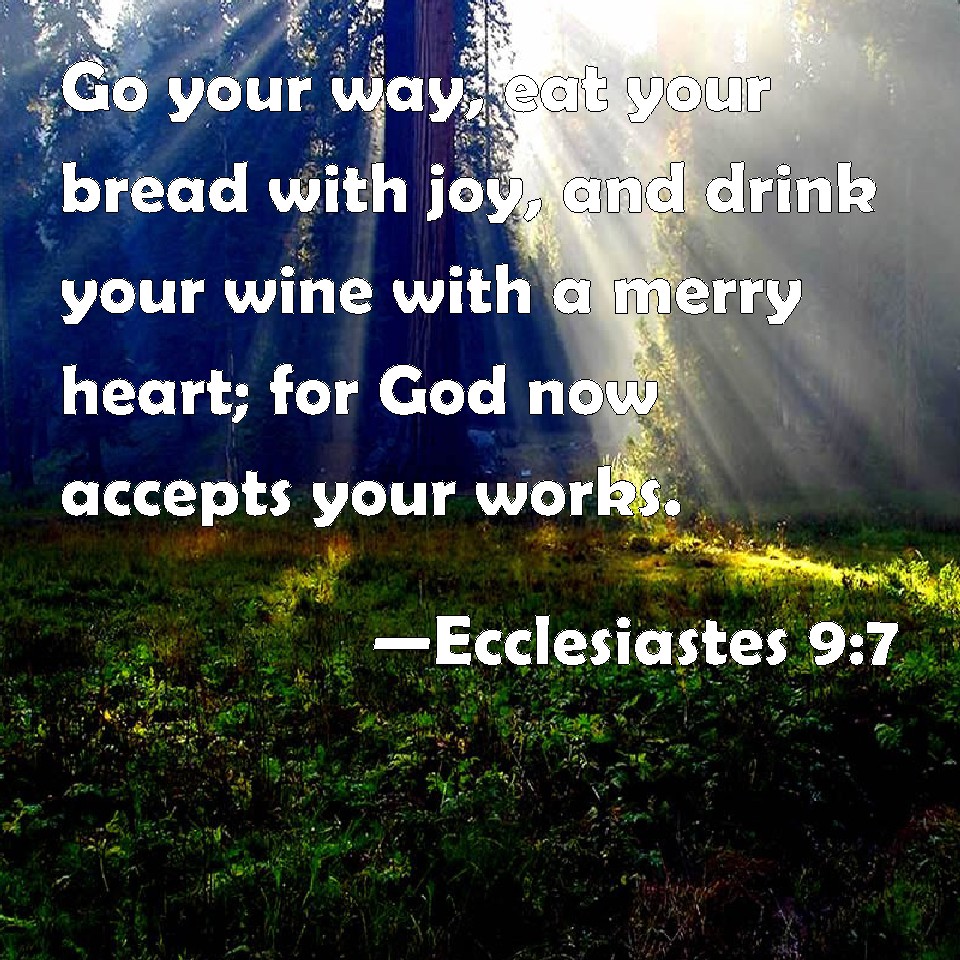 Choose a Background Ecclesiastes 9:7 Go your way, eat your bread with joy, and drink your wine with a merry heart; for God now accepts your works. KJV: Go thy way, eat thy bread with joy, and drink thy wine with a merry heart; for God now accepteth thy works. DRB: Go then, and eat thy bread with joy, and drink thy wine with gladness: because thy works please God. DBT: Go, eat thy bread with joy, and drink thy wine with a merry heart; for God hath already accepted thy works. ERV: Go thy way, eat thy bread with joy, and drink thy wine with a merry heart; for God hath already accepted thy works. WBT: Go thy way, eat thy bread with joy, and drink thy wine with a merry heart; for God now accepteth thy works. WEB: Go your way—eat your bread with joy, and drink your wine with a merry heart; for God has already accepted your works. YLT: Go, eat with joy thy bread, and drink with a glad heart thy wine, for already hath God been pleased with thy works.Links Ecclesiastes 9:7 NIV • Ecclesiastes 9:7 NLT • Ecclesiastes 9:7 ESV • Ecclesiastes 9:7 NASB • Ecclesiastes 9:7 KJV • Ecclesiastes 9:7 Interlinear • Ecclesiastes 9:7 Commentaries • Ecclesiastes 9:7 Parallel Texts • Ecclesiastes 9:7 Bible Apps • Ecclesiastes 9:7 Parallel • Bible Hub |