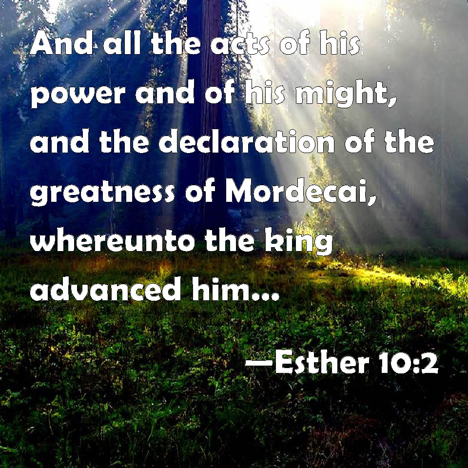 Choose a Background Esther 10:2 And all the acts of his power and of his might, and the declaration of the greatness of Mordecai, whereunto the king advanced him, are they not written in the book of the chronicles of the kings of Media and Persia? KJV: And all the acts of his power and of his might, and the declaration of the greatness of Mordecai, whereunto the king advanced him, are they not written in the book of the chronicles of the kings of Media and Persia? DRB: And his strength and his empire, and the dignity and greatness wherewith he exalted Mardochai, are written in the books of the Medes, and of the Persians: DBT: And all the acts of his power and of his might, and the declaration of the greatness of Mordecai, to which the king advanced him, are they not written in the book of the chronicles of the kings of Media and Persia? ERV: And all the acts of his power and of his might, and the full account of the greatness of Mordecai, whereunto the king advanced him, are they not written in the book of the chronicles of the kings of Media and Persia? WBT: And all the acts of his power and of his might, and the declaration of the greatness of Mordecai, to which the king advanced him, are they not written in the book of the chronicles of the kings of Media and Persia? WEB: All the acts of his power and of his might, and the full account of the greatness of Mordecai, to which the king advanced him, aren't they written in the book of the chronicles of the kings of Media and Persia? YLT: and all the work of his strength, and his might, and the explanation of the greatness of Mordecai with which the king made him great, are they not written on the book of the Chronicles of Media and Persia?Links Esther 10:2 NIV • Esther 10:2 NLT • Esther 10:2 ESV • Esther 10:2 NASB • Esther 10:2 KJV • Esther 10:2 Interlinear • Esther 10:2 Commentaries • Esther 10:2 Parallel Texts • Esther 10:2 Bible Apps • Esther 10:2 Parallel • Bible Hub |