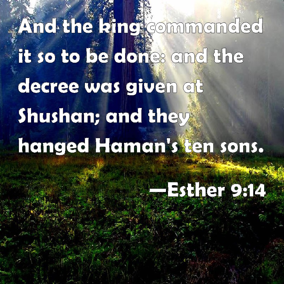 And the king commanded that it should be so done. And forthwith the edict was hung up in Susan, and the ten sons of Aman were hanged.
