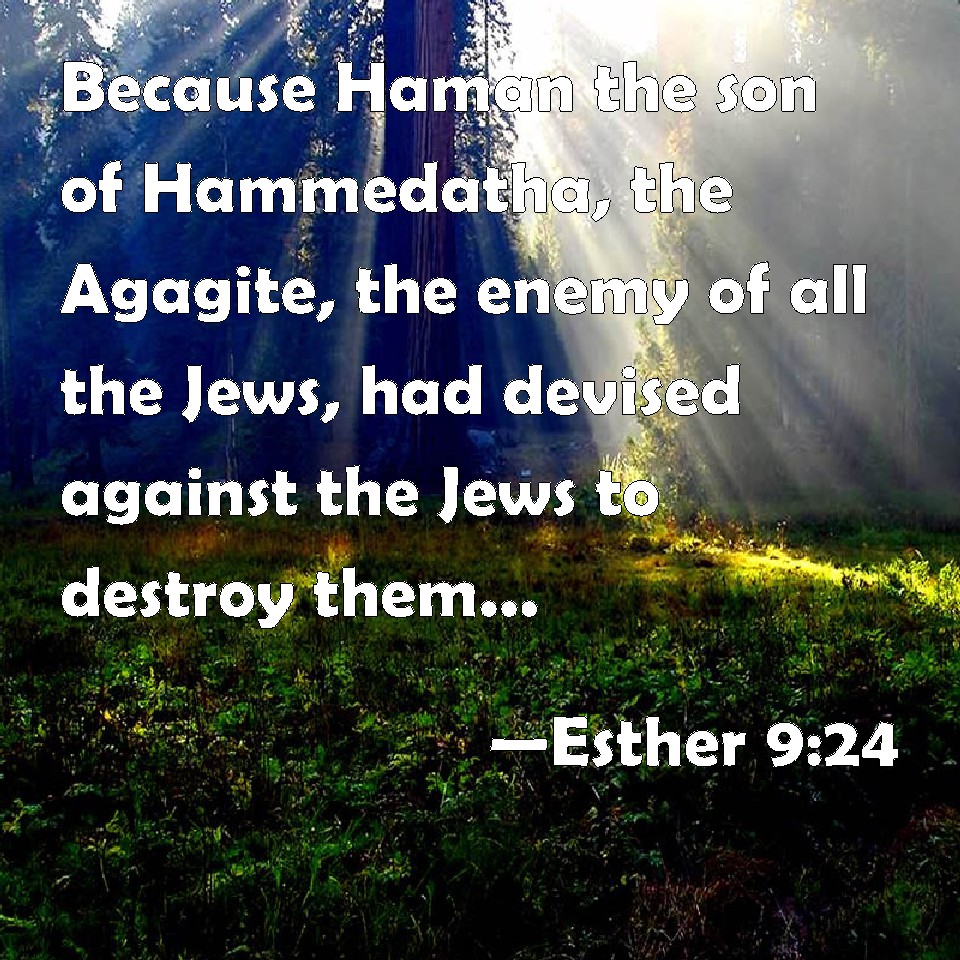 Choose a Background Esther 9:24 Because Haman the son of Hammedatha, the Agagite, the enemy of all the Jews, had devised against the Jews to destroy them, and had cast Pur, that is, the lot, to consume them, and to destroy them; KJV: Because Haman the son of Hammedatha, the Agagite, the enemy of all the Jews, had devised against the Jews to destroy them, and had cast Pur, that is, the lot, to consume them, and to destroy them; DRB: For Aman, the son of Amadathi of the race of Agag, the enemy and adversary of the Jews, had devised evil against them, to kill them and destroy them: and had cast Phur, that is, the lot. DBT: For Haman the son of Hammedatha the Agagite, the oppressor of all the Jews, had devised against the Jews to destroy them, and had cast Pur, that is, the lot, to consume them and to destroy them; ERV: because Haman the son of Hammedatha, the Agagite, the enemy of all the Jews, had devised against the Jews to destroy them, and had cast Pur, that is, the lot, to consume them, and to destroy them; WBT: Because Haman the son of Hammedatha, the Agagite, the enemy of all the Jews, had devised against the Jews to destroy them, and had cast Pur, that is, the lot, to consume them, and to destroy them; WEB: because Haman the son of Hammedatha, the Agagite, the enemy of all the Jews, had plotted against the Jews to destroy them, and had cast "Pur," that is the lot, to consume them, and to destroy them; YLT: because Haman son of Hammedatha the Agagite, adversary of all the Jews, had devised concerning the Jews to destroy them, and had caused to fall Pur — that is the lot — to crush them and to destroy them;Links Esther 9:24 NIV • Esther 9:24 NLT • Esther 9:24 ESV • Esther 9:24 NASB • Esther 9:24 KJV • Esther 9:24 Interlinear • Esther 9:24 Commentaries • Esther 9:24 Parallel Texts • Esther 9:24 Bible Apps • Esther 9:24 Parallel • Bible Hub |