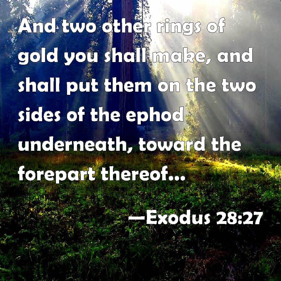 Choose a Background Exodus 28:27 And two other rings of gold you shall make, and shall put them on the two sides of the ephod underneath, toward the forepart thereof, over against the other coupling thereof, above the curious girdle of the ephod. KJV: And two other rings of gold thou shalt make, and shalt put them on the two sides of the ephod underneath, toward the forepart thereof, over against the other coupling thereof, above the curious girdle of the ephod. DRB: Moreover also other two rings of gold, which are to be set on each side of the ephod beneath, that looketh towards the nether joining, that the rational may be fitted with the ephod, DBT: And two rings of gold shalt thou make, and shalt put them upon the two shoulder-pieces of the ephod underneath, to the front thereof just by the coupling thereof, above the girdle of the ephod. ERV: And thou shalt make two rings of gold, and shalt put them on the two shoulderpieces of the ephod underneath, in the forepart thereof, close by the coupling thereof, above the cunningly woven band of the ephod. WBT: And two other rings of gold thou shalt make, and shalt put them on the two sides of the ephod underneath, towards the forepart of it, over against the other coupling thereof, above the curious girdle of the ephod. WEB: You shall make two rings of gold, and shall put them on the two shoulder straps of the ephod underneath, in its forepart, close by its coupling, above the skillfully woven band of the ephod. YLT: and thou hast made two rings of gold, and hast put them on the two shoulders of the ephod, beneath, over-against its front, over-against its joining, above the girdle of the ephod,Links Exodus 28:27 NIV • Exodus 28:27 NLT • Exodus 28:27 ESV • Exodus 28:27 NASB • Exodus 28:27 KJV • Exodus 28:27 Interlinear • Exodus 28:27 Commentaries • Exodus 28:27 Parallel Texts • Exodus 28:27 Bible Apps • Exodus 28:27 Parallel • Bible Hub |