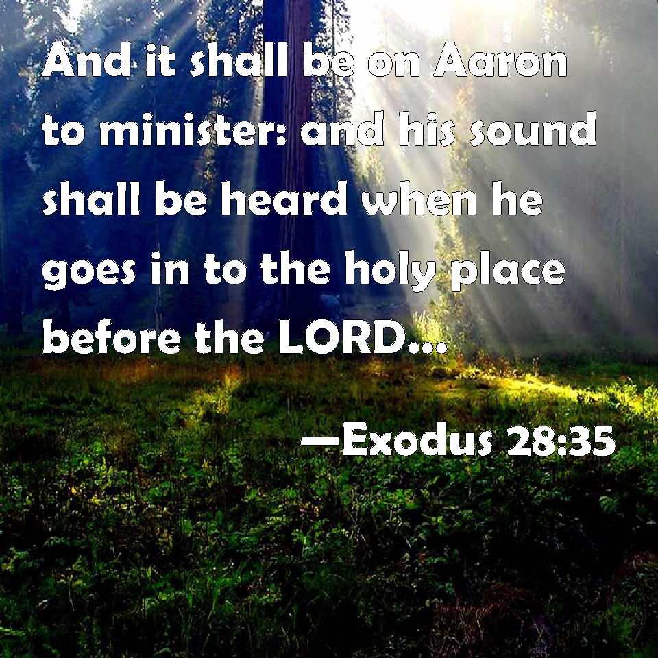 Choose a Background Exodus 28:35 And it shall be on Aaron to minister: and his sound shall be heard when he goes in to the holy place before the LORD, and when he comes out, that he die not. KJV: And it shall be upon Aaron to minister: and his sound shall be heard when he goeth in unto the holy place before the LORD, and when he cometh out, that he die not. DRB: And Aaron shall be vested with it in the office of his ministry, that the sound may be heard, when he goeth in and cometh out of the sanctuary, in the sight of the Lord, and that he may not die. DBT: And it shall be on Aaron for service; that his sound may be heard when he goeth into the sanctuary before Jehovah, and when he cometh out, that he may not die. ERV: And it shall be upon Aaron to minister: and the sound thereof shall be heard when he goeth in unto the holy place before the LORD, and when he cometh out, that he die not. WBT: And it shall be upon Aaron, to minister: and his sound shall be heard when he goeth in to the holy place before the LORD, and when he cometh out; that he may not die. WEB: It shall be on Aaron to minister: and its sound shall be heard when he goes in to the holy place before Yahweh, and when he comes out, that he not die. YLT: 'And it hath been on Aaron to minister in, and its sound hath been heard in his coming in unto the sanctuary before Jehovah, and in his going out, and he doth not die.Links Exodus 28:35 NIV • Exodus 28:35 NLT • Exodus 28:35 ESV • Exodus 28:35 NASB • Exodus 28:35 KJV • Exodus 28:35 Interlinear • Exodus 28:35 Commentaries • Exodus 28:35 Parallel Texts • Exodus 28:35 Bible Apps • Exodus 28:35 Parallel • Bible Hub |