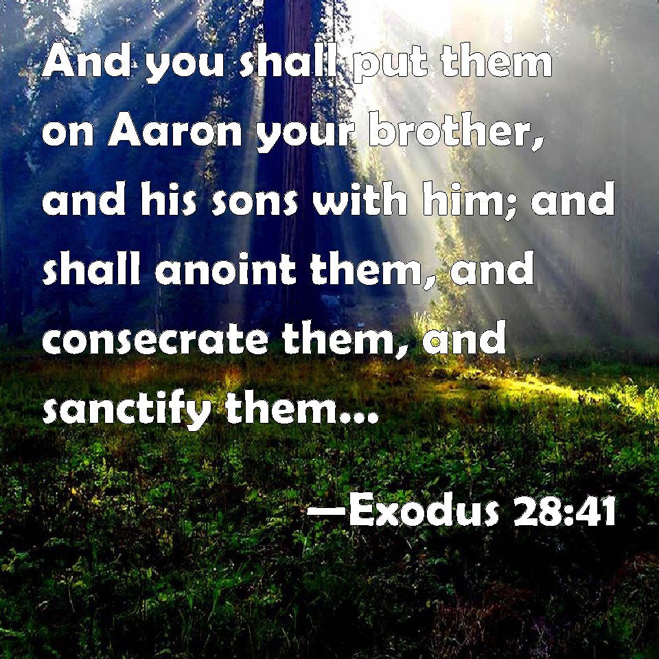 Choose a Background Exodus 28:41 And you shall put them on Aaron your brother, and his sons with him; and shall anoint them, and consecrate them, and sanctify them, that they may minister to me in the priest's office. KJV: And thou shalt put them upon Aaron thy brother, and his sons with him; and shalt anoint them, and consecrate them, and sanctify them, that they may minister unto me in the priest's office. DRB: And with all these things thou shalt vest Aaron thy brother, and his sons with him. And thou shalt consecrate the hands of them all, and shalt sanctify them, that they may do the office of priesthood unto me. DBT: And thou shalt clothe with them Aaron thy brother, and his sons with him; and shalt anoint them, and consecrate them, and hallow them, that they may serve me as priests. ERV: And thou shalt put them upon Aaron thy brother, and upon his sons with him; and shalt anoint them, and consecrate them, and sanctify them, that they may minister unto me in the priest's office. WBT: And thou shalt put them upon Aaron thy brother, and on his sons with him: and shalt anoint them, and consecrate them, and sanctify them, that they may minister to me in the priest's office. WEB: You shall put them on Aaron your brother, and on his sons with him, and shall anoint them, and consecrate them, and sanctify them, that they may minister to me in the priest's office. YLT: and thou hast clothed Aaron thy brother with them, and his sons with him, and hast anointed them, and hast consecrated their hand, and hast sanctified them, and they have been priests to Me.Links Exodus 28:41 NIV • Exodus 28:41 NLT • Exodus 28:41 ESV • Exodus 28:41 NASB • Exodus 28:41 KJV • Exodus 28:41 Interlinear • Exodus 28:41 Commentaries • Exodus 28:41 Parallel Texts • Exodus 28:41 Bible Apps • Exodus 28:41 Parallel • Bible Hub |