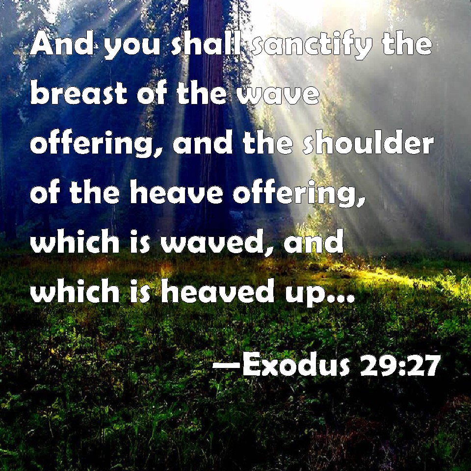 Choose a Background Exodus 29:27 And you shall sanctify the breast of the wave offering, and the shoulder of the heave offering, which is waved, and which is heaved up, of the ram of the consecration, even of that which is for Aaron, and of that which is for his sons: KJV: And thou shalt sanctify the breast of the wave offering, and the shoulder of the heave offering, which is waved, and which is heaved up, of the ram of the consecration, even of that which is for Aaron, and of that which is for his sons: DRB: And thou shalt sanctify both the consecrated breast, and the shoulder that thou didst separate of the ram, DBT: And thou shalt hallow the breast of the wave-offering, and the shoulder of the heave-offering, that hath been waved and heaved up, of the ram of the consecration, of that which is for Aaron, and of that which is for his sons. ERV: And thou shalt sanctify the breast of the wave offering, and the thigh of the heave offering, which is waved, and which is heaved up, of the ram of consecration, even of that which is for Aaron, and of that which is for his sons: WBT: And thou shalt sanctify the breast of the wave-offering, and the shoulder of the heave-offering, which is waved, and which is heaved up of the ram of the consecration, even of that which is for Aaron, and of that which is for his sons: WEB: You shall sanctify the breast of the wave offering, and the thigh of the wave offering, which is waved, and which is heaved up, of the ram of consecration, even of that which is for Aaron, and of that which is for his sons: YLT: and thou hast sanctified the breast of the wave-offering, and the leg of the heave-offering, which hath been waved, and which hath been lifted up from the ram of the consecration, of that which is for Aaron, and of that which is for his sons;Links Exodus 29:27 NIV • Exodus 29:27 NLT • Exodus 29:27 ESV • Exodus 29:27 NASB • Exodus 29:27 KJV • Exodus 29:27 Interlinear • Exodus 29:27 Commentaries • Exodus 29:27 Parallel Texts • Exodus 29:27 Bible Apps • Exodus 29:27 Parallel • Bible Hub |