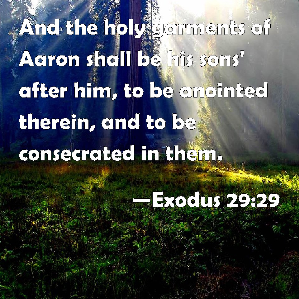 Choose a Background Exodus 29:29 And the holy garments of Aaron shall be his sons' after him, to be anointed therein, and to be consecrated in them. KJV: And the holy garments of Aaron shall be his sons' after him, to be anointed therein, and to be consecrated in them. DRB: And the holy vesture, which Aaron shall use, his sons shall have after him, that they may be anointed, and their hands consecrated to it. DBT: And the holy garments of Aaron shall be his sons' after him, to be anointed therein, and to be consecrated in them. ERV: And the holy garments of Aaron shall be for his sons after him, to be anointed in them, and to be consecrated in them. WBT: And the holy garments of Aaron shall be his sons' after him, to be anointed therein, and to be consecrated in them. WEB: "The holy garments of Aaron shall be for his sons after him, to be anointed in them, and to be consecrated in them. YLT: 'And the holy garments which are Aaron's, are for his sons after him, to be anointed in them, and to consecrate in them their hand;Links Exodus 29:29 NIV • Exodus 29:29 NLT • Exodus 29:29 ESV • Exodus 29:29 NASB • Exodus 29:29 KJV • Exodus 29:29 Interlinear • Exodus 29:29 Commentaries • Exodus 29:29 Parallel Texts • Exodus 29:29 Bible Apps • Exodus 29:29 Parallel • Bible Hub |