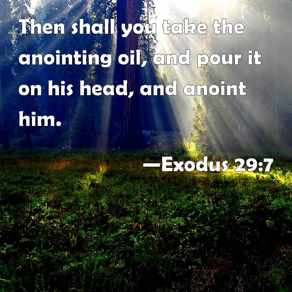Choose a Background Exodus 29:7 Then shall you take the anointing oil, and pour it on his head, and anoint him. KJV: Then shalt thou take the anointing oil, and pour it upon his head, and anoint him. DRB: And thou shalt pour the oil of unction upon his head: and by this rite shall he be consecrated. DBT: and shalt take the anointing oil, and pour it on his head, and anoint him. ERV: Then shalt thou take the anointing oil, and pour it upon his head, and anoint him. WBT: Then shalt thou take the anointing oil, and pour it upon his head, and anoint him. WEB: Then you shall take the anointing oil, and pour it on his head, and anoint him. YLT: and hast taken the anointing oil, and hast poured it on his head, and hast anointed him.Links Exodus 29:7 NIV • Exodus 29:7 NLT • Exodus 29:7 ESV • Exodus 29:7 NASB • Exodus 29:7 KJV • Exodus 29:7 Interlinear • Exodus 29:7 Commentaries • Exodus 29:7 Parallel Texts • Exodus 29:7 Bible Apps • Exodus 29:7 Parallel • Bible Hub |