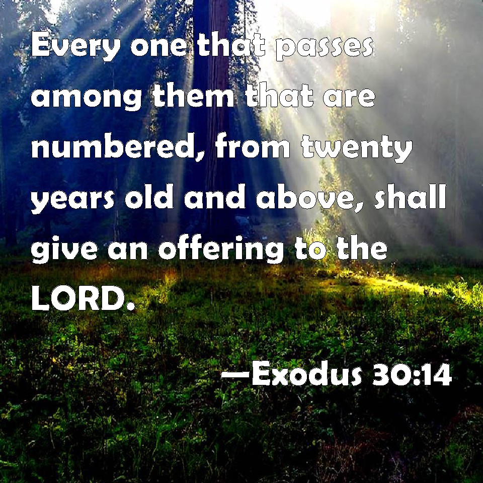 Choose a Background Exodus 30:14 Every one that passes among them that are numbered, from twenty years old and above, shall give an offering to the LORD. KJV: Every one that passeth among them that are numbered, from twenty years old and above, shall give an offering unto the LORD. DRB: He that is counted in the number from twenty years and upwards, shall give the price. DBT: Every one that passeth among those that are numbered, from twenty years old and above, shall give the heave-offering of Jehovah. ERV: Every one that passeth over unto them that are numbered, from twenty years old and upward, shall give the offering of the LORD. WBT: Every one that passeth among them that are numbered from twenty years old and above, shall give an offering to the LORD. WEB: Everyone who passes over to those who are numbered, from twenty years old and upward, shall give the offering to Yahweh. YLT: every one passing over unto those numbered, from a son of twenty years and upwards, doth give the heave-offering of Jehovah;Links Exodus 30:14 NIV • Exodus 30:14 NLT • Exodus 30:14 ESV • Exodus 30:14 NASB • Exodus 30:14 KJV • Exodus 30:14 Interlinear • Exodus 30:14 Commentaries • Exodus 30:14 Parallel Texts • Exodus 30:14 Bible Apps • Exodus 30:14 Parallel • Bible Hub |