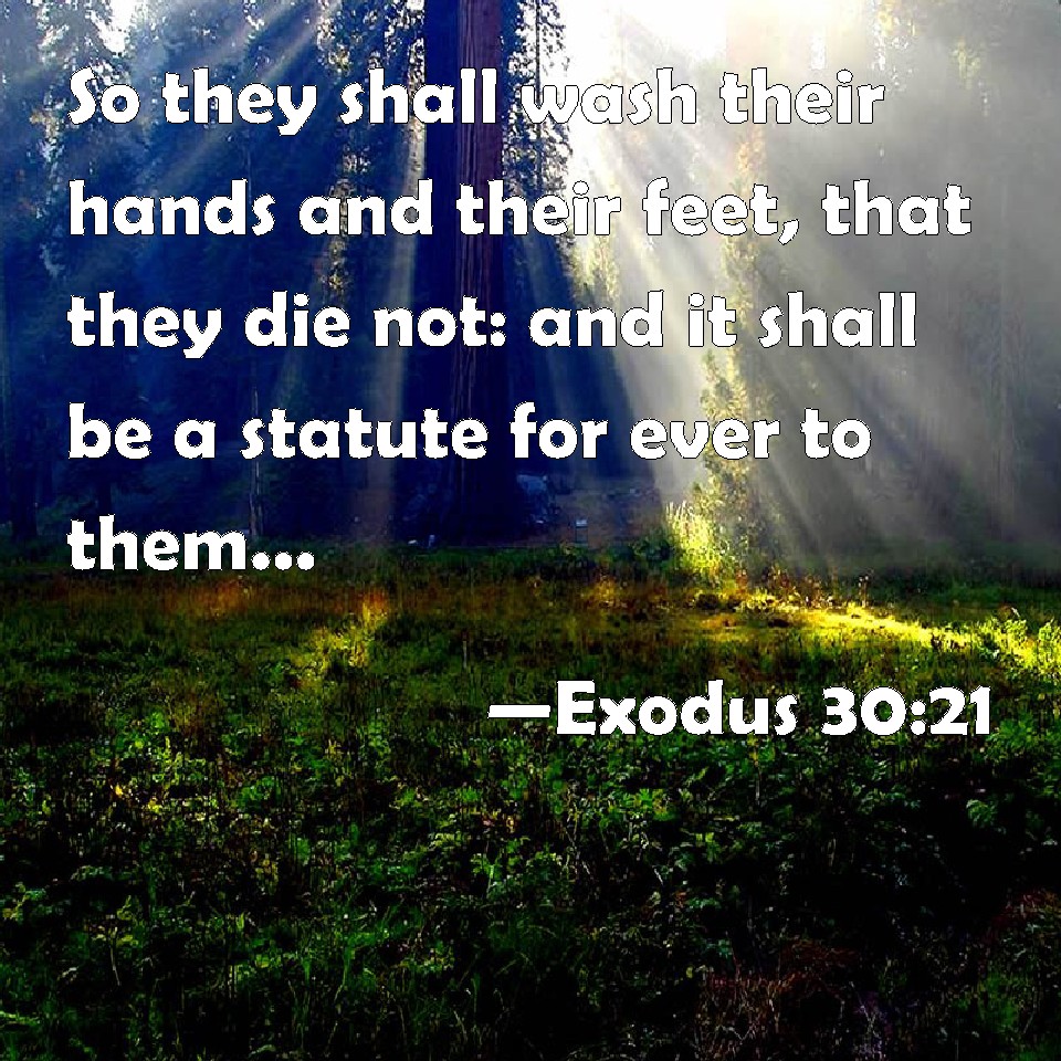 Choose a Background Exodus 30:21 So they shall wash their hands and their feet, that they die not: and it shall be a statute for ever to them, even to him and to his seed throughout their generations. KJV: So they shall wash their hands and their feet, that they die not: and it shall be a statute for ever to them, even to him and to his seed throughout their generations. DRB: Lest perhaps they die. It shall be an everlasting law to him, and to his seed by successions. DBT: And they shall wash their hands and their feet, that they may not die; and it shall be an everlasting statute for them, for him and for his seed throughout their generations. ERV: so they shall wash their hands and their feet, that they die not: and it shall be a statute for ever to them, even to him and to his seed throughout their generations. WBT: So they shall wash their hands and their feet, that they die not: and it shall be a statute for ever to them, even to him and to his seed throughout their generations. WEB: So they shall wash their hands and their feet, that they not die: and it shall be a statute forever to them, even to him and to his descendants throughout their generations." YLT: then they have washed their hands and their feet, and they die not, and it hath been to them a statute age-during, to him and to his seed to their generations.'Links Exodus 30:21 NIV • Exodus 30:21 NLT • Exodus 30:21 ESV • Exodus 30:21 NASB • Exodus 30:21 KJV • Exodus 30:21 Interlinear • Exodus 30:21 Commentaries • Exodus 30:21 Parallel Texts • Exodus 30:21 Bible Apps • Exodus 30:21 Parallel • Bible Hub |