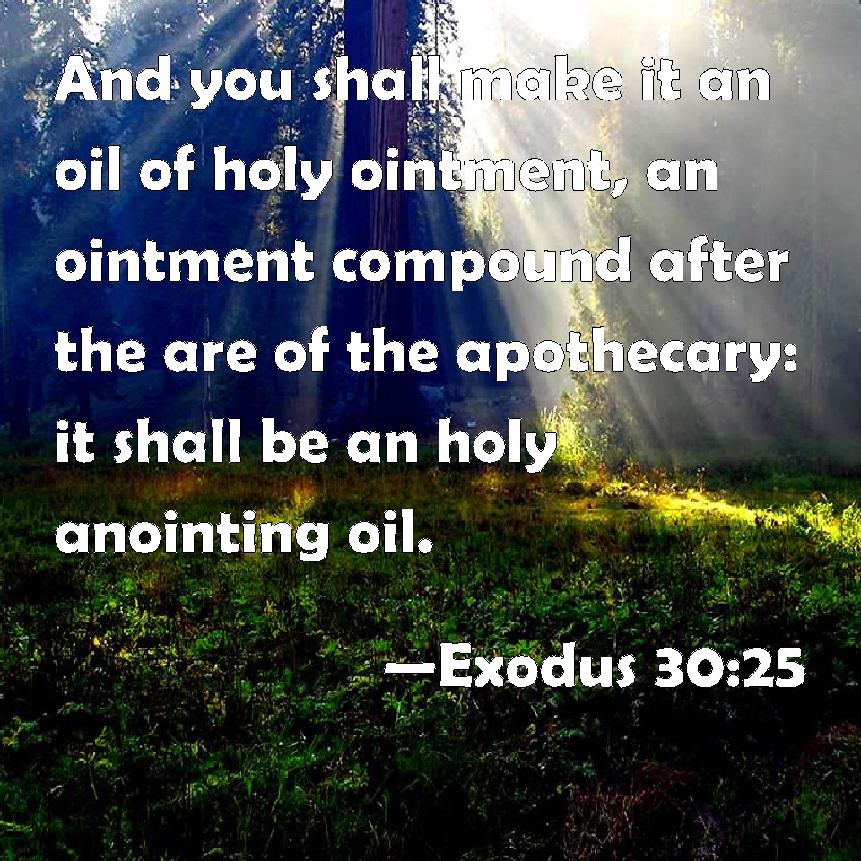 Choose a Background Exodus 30:25 And you shall make it an oil of holy ointment, an ointment compound after the are of the apothecary: it shall be an holy anointing oil. KJV: And thou shalt make it an oil of holy ointment, an ointment compound after the art of the apothecary: it shall be an holy anointing oil. DRB: And thou shalt make the holy oil of unction, an ointment compounded after the art of the perfumer, DBT: and make of it an oil of holy ointment, a perfume of perfumery after the work of the perfumer: it shall be the holy anointing oil. ERV: and thou shalt make it an holy anointing oil, a perfume compounded after the art of the perfumer: it shall be an holy anointing oil. WBT: And thou shalt make it an oil of holy ointment, an ointment compound after the art of the apothecary: it shall be a holy anointing oil. WEB: You shall make it a holy anointing oil, a perfume compounded after the art of the perfumer: it shall be a holy anointing oil. YLT: and thou hast made it a holy anointing oil, a compound mixture, work of a compounder; it is a holy anointing oil.Links Exodus 30:25 NIV • Exodus 30:25 NLT • Exodus 30:25 ESV • Exodus 30:25 NASB • Exodus 30:25 KJV • Exodus 30:25 Interlinear • Exodus 30:25 Commentaries • Exodus 30:25 Parallel Texts • Exodus 30:25 Bible Apps • Exodus 30:25 Parallel • Bible Hub |