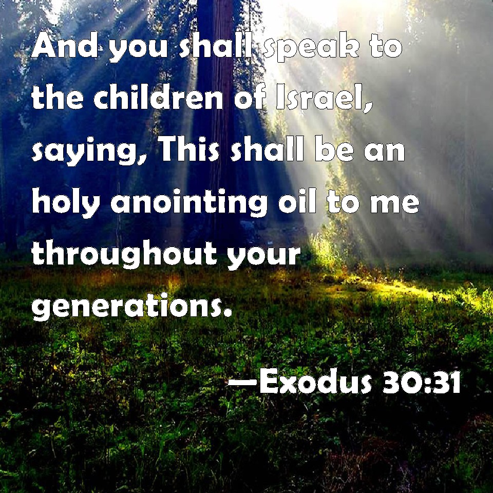 Choose a Background Exodus 30:31 And you shall speak to the children of Israel, saying, This shall be an holy anointing oil to me throughout your generations. KJV: And thou shalt speak unto the children of Israel, saying, This shall be an holy anointing oil unto me throughout your generations. DRB: And thou shalt say to the children of Israel: This oil of unction shall be holy unto me throughout your generations. DBT: And thou shalt speak to the children of Israel, saying, A holy anointing oil shall this be unto me throughout your generations. ERV: And thou shalt speak unto the children of Israel, saying, This shall be an holy anointing oil unto me throughout your generations. WBT: And thou shalt speak to the children of Israel, saying, This shall be a holy anointing oil to me, throughout your generations. WEB: You shall speak to the children of Israel, saying, 'This shall be a holy anointing oil to me throughout your generations. YLT: 'And unto the sons of Israel thou dost speak, saying, A holy anointing oil is this to Me, to your generations;Links Exodus 30:31 NIV • Exodus 30:31 NLT • Exodus 30:31 ESV • Exodus 30:31 NASB • Exodus 30:31 KJV • Exodus 30:31 Interlinear • Exodus 30:31 Commentaries • Exodus 30:31 Parallel Texts • Exodus 30:31 Bible Apps • Exodus 30:31 Parallel • Bible Hub |
