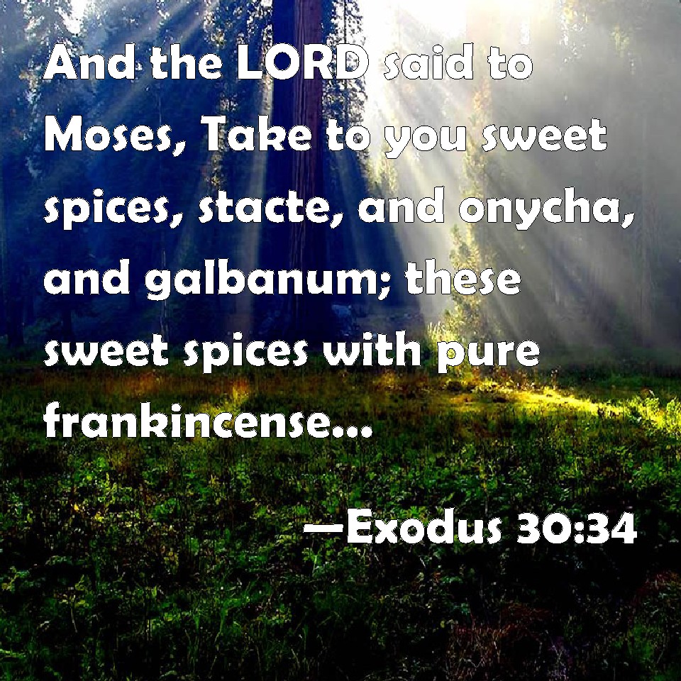 Choose a Background Exodus 30:34 And the LORD said to Moses, Take to you sweet spices, stacte, and onycha, and galbanum; these sweet spices with pure frankincense: of each shall there be a like weight: KJV: And the LORD said unto Moses, Take unto thee sweet spices, stacte, and onycha, and galbanum; these sweet spices with pure frankincense: of each shall there be a like weight: DRB: And the Lord said to Moses: Take unto thee spices, stacte, and onycha, galbanum of sweet savour, and the clearest frankincense, all shall be of equal weight. DBT: And Jehovah said to Moses, Take fragrant drugs stacte, and onycha, and galbanum fragrant drugs and pure frankincense; in like proportions shall it be. ERV: And the LORD said unto Moses, Take unto thee sweet spices, stacte, and onycha, and galbanum; sweet spices with pure frankincense: of each shall there be a like weight; WBT: And the LORD said to Moses, Take to thee sweet spices, stacte, and onycha, and galbanum; these sweet spices with pure frankincense: of each shall there be a like weight: WEB: Yahweh said to Moses, "Take to yourself sweet spices, gum resin, and onycha, and galbanum; sweet spices with pure frankincense: of each shall there be an equal weight; YLT: And Jehovah saith unto Moses, 'Take to thee spices, stacte, and onycha, and galbanum, spices and pure frankincense; they are part for part;Links Exodus 30:34 NIV • Exodus 30:34 NLT • Exodus 30:34 ESV • Exodus 30:34 NASB • Exodus 30:34 KJV • Exodus 30:34 Interlinear • Exodus 30:34 Commentaries • Exodus 30:34 Parallel Texts • Exodus 30:34 Bible Apps • Exodus 30:34 Parallel • Bible Hub |