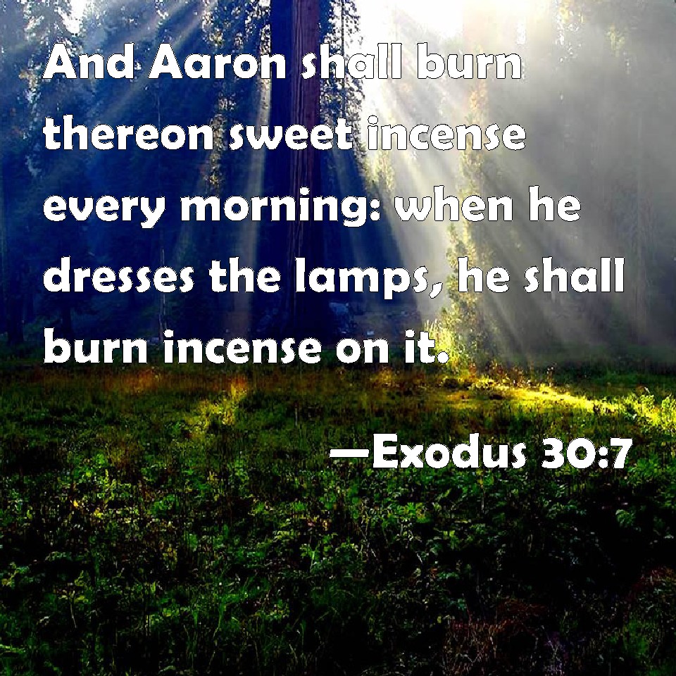 Choose a Background Exodus 30:7 And Aaron shall burn thereon sweet incense every morning: when he dresses the lamps, he shall burn incense on it. KJV: And Aaron shall burn thereon sweet incense every morning: when he dresseth the lamps, he shall burn incense upon it. DRB: And Aaron shall burn sweet smelling incense upon it in the morning. When he shall dress the lamps, he shall burn it: DBT: And Aaron shall burn thereon fragrant incense: every morning, when he dresseth the lamps, he shall burn the incense. ERV: And Aaron shall burn thereon incense of sweet spices: every morning, when he dresseth the lamps, he shall burn it. WBT: And Aaron shall burn upon it sweet incense every morning: when he dresseth the lamps, he shall burn incense upon it. WEB: Aaron shall burn incense of sweet spices on it every morning. When he tends the lamps, he shall burn it. YLT: 'And Aaron hath made perfume on it, perfume of spices, morning by morning; in his making the lamps right he doth perfume it,Links Exodus 30:7 NIV • Exodus 30:7 NLT • Exodus 30:7 ESV • Exodus 30:7 NASB • Exodus 30:7 KJV • Exodus 30:7 Interlinear • Exodus 30:7 Commentaries • Exodus 30:7 Parallel Texts • Exodus 30:7 Bible Apps • Exodus 30:7 Parallel • Bible Hub |