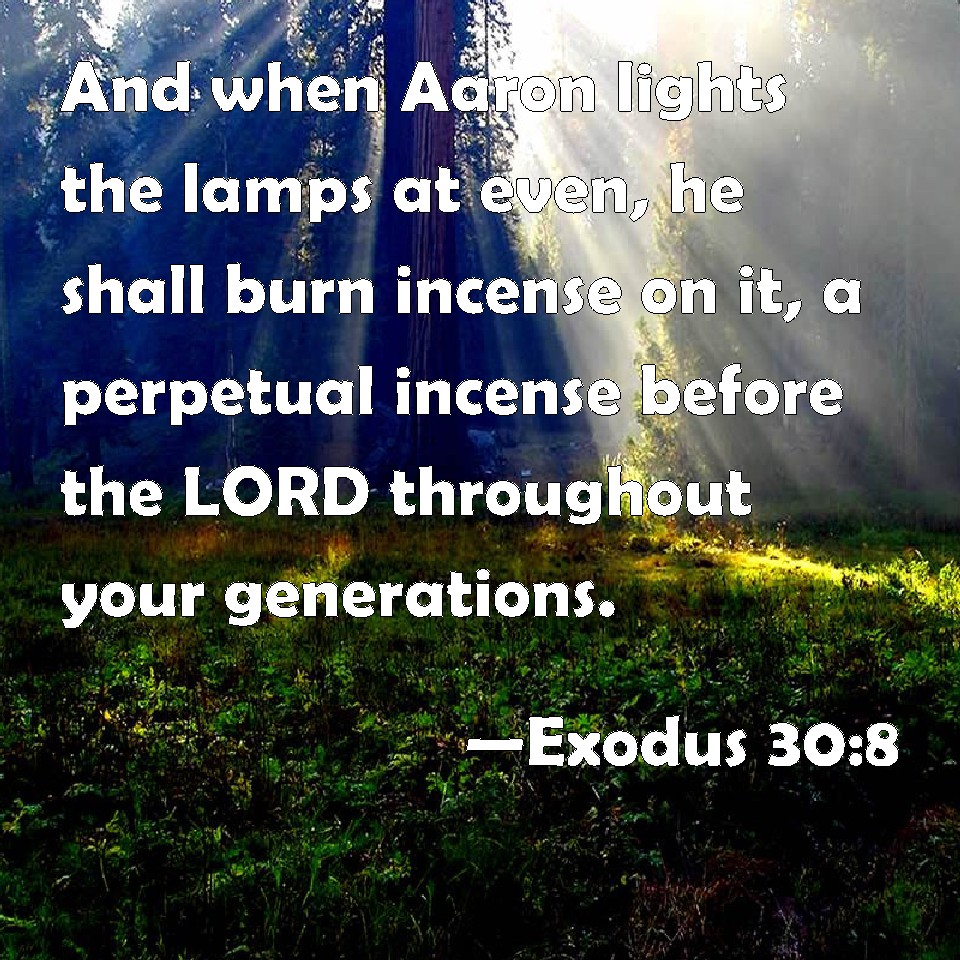 Choose a Background Exodus 30:8 And when Aaron lights the lamps at even, he shall burn incense on it, a perpetual incense before the LORD throughout your generations. KJV: And when Aaron lighteth the lamps at even, he shall burn incense upon it, a perpetual incense before the LORD throughout your generations. DRB: And when he shall place them in the evening, he shall burn an everlasting incense before the Lord throughout your generations. DBT: And when Aaron lighteth the lamps between the two evenings, he shall burn the incense a continual incense before Jehovah throughout your generations. ERV: And when Aaron lighteth the lamps at even, he shall burn it, a perpetual incense before the LORD throughout your generations. WBT: And when Aaron lighteth the lamps at evening, he shall burn incense upon it; a perpetual incense before the LORD, throughout your generations. WEB: When Aaron lights the lamps at evening, he shall burn it, a perpetual incense before Yahweh throughout your generations. YLT: and in Aaron's causing the lamps to go up between the evenings, he doth perfume it; a continual perfume before Jehovah to your generations.Links Exodus 30:8 NIV • Exodus 30:8 NLT • Exodus 30:8 ESV • Exodus 30:8 NASB • Exodus 30:8 KJV • Exodus 30:8 Interlinear • Exodus 30:8 Commentaries • Exodus 30:8 Parallel Texts • Exodus 30:8 Bible Apps • Exodus 30:8 Parallel • Bible Hub |