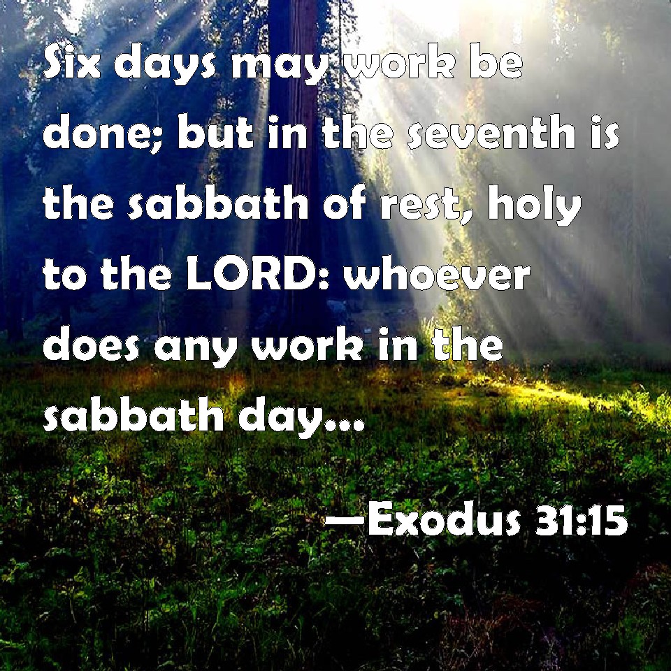 Choose a Background Exodus 31:15 Six days may work be done; but in the seventh is the sabbath of rest, holy to the LORD: whoever does any work in the sabbath day, he shall surely be put to death. KJV: Six days may work be done; but in the seventh is the sabbath of rest, holy to the LORD: whosoever doeth any work in the sabbath day, he shall surely be put to death. DRB: Six days shall you do work: in the seventh day is the sabbath, the rest holy to the Lord. Every one that shall do any work on this day, shall die. DBT: Six days shall work be done; but on the seventh day is the sabbath of rest, holy to Jehovah: whoever doeth work on the sabbath day shall certainly be put to death. ERV: Six days shall work be done; but on the seventh day is a sabbath of solemn rest, holy to the LORD: whosoever doeth any work in the sabbath day, he shall surely be put to death. WBT: Six days may work be done, but in the seventh is the sabbath of rest, holy to the LORD: whoever doeth any work in the sabbath-day, he shall surely be put to death. WEB: Six days shall work be done, but on the seventh day is a Sabbath of solemn rest, holy to Yahweh. Whoever does any work on the Sabbath day shall surely be put to death. YLT: Six days is work done, and in the seventh day is a sabbath of holy rest to Jehovah; any who doeth work in the sabbath-day is certainly put to death,Links Exodus 31:15 NIV • Exodus 31:15 NLT • Exodus 31:15 ESV • Exodus 31:15 NASB • Exodus 31:15 KJV • Exodus 31:15 Interlinear • Exodus 31:15 Commentaries • Exodus 31:15 Parallel Texts • Exodus 31:15 Bible Apps • Exodus 31:15 Parallel • Bible Hub |