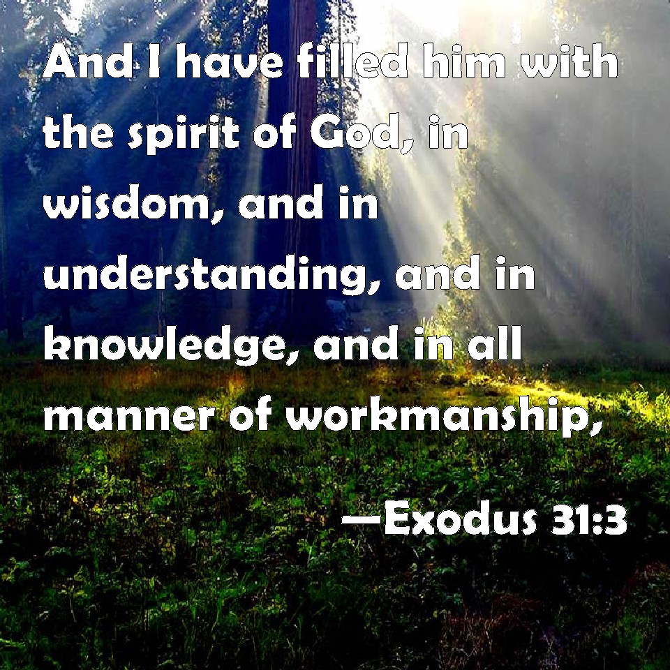 Choose a Background Exodus 31:3 And I have filled him with the spirit of God, in wisdom, and in understanding, and in knowledge, and in all manner of workmanship, KJV: And I have filled him with the spirit of God, in wisdom, and in understanding, and in knowledge, and in all manner of workmanship, DRB: And I have filled him with the spirit of God, with wisdom and understanding, and knowledge in all manner of work. DBT: and have filled him with the spirit of God, in wisdom, and in understanding, and in knowledge, and in every work, ERV: and I have filled him with the spirit of God, in wisdom, and in understanding, and in knowledge, and in all manner of workmanship, WBT: And I have filled him with the spirit of God, in wisdom, and in understanding, and in knowledge, and in all manner of workmanship, WEB: and I have filled him with the Spirit of God, in wisdom, and in understanding, and in knowledge, and in all kinds of workmanship, YLT: and I fill him with the Spirit of God, in wisdom, and in understanding, and in knowledge, and in all work,Links Exodus 31:3 NIV • Exodus 31:3 NLT • Exodus 31:3 ESV • Exodus 31:3 NASB • Exodus 31:3 KJV • Exodus 31:3 Interlinear • Exodus 31:3 Commentaries • Exodus 31:3 Parallel Texts • Exodus 31:3 Bible Apps • Exodus 31:3 Parallel • Bible Hub |