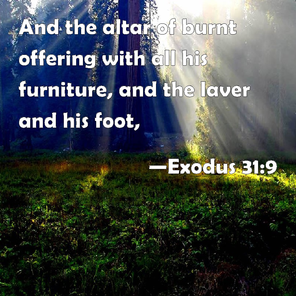 Choose a Background Exodus 31:9 And the altar of burnt offering with all his furniture, and the laver and his foot, KJV: And the altar of burnt offering with all his furniture, and the laver and his foot, DRB: And of holocaust, and all their vessels, the laver with its foot, DBT: and the altar of burnt-offering and all its utensils, and the laver and its stand; ERV: and the altar of burnt offering with all its vessels, and the laver and its base; WBT: And the altar of burnt-offering, with all its furniture, and the laver and its foot, WEB: the altar of burnt offering with all its vessels, the basin and its base, YLT: and the altar of the burnt-offering and all its vessels, and the laver and its base,Links Exodus 31:9 NIV • Exodus 31:9 NLT • Exodus 31:9 ESV • Exodus 31:9 NASB • Exodus 31:9 KJV • Exodus 31:9 Interlinear • Exodus 31:9 Commentaries • Exodus 31:9 Parallel Texts • Exodus 31:9 Bible Apps • Exodus 31:9 Parallel • Bible Hub |