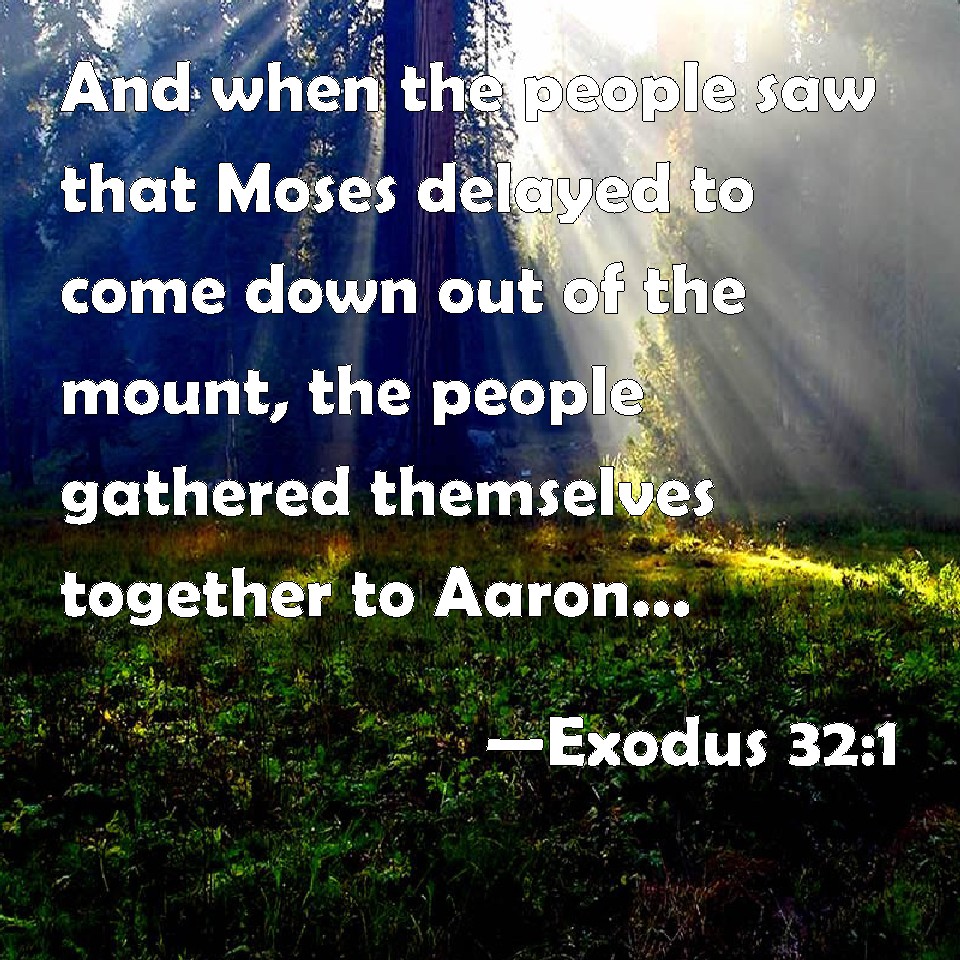 Choose a Background Exodus 32:1 And when the people saw that Moses delayed to come down out of the mount, the people gathered themselves together to Aaron, and said to him, Up, make us gods, which shall go before us; for as for this Moses, the man that brought us up out of the land of Egypt, we know not what is become of him. KJV: And when the people saw that Moses delayed to come down out of the mount, the people gathered themselves together unto Aaron, and said unto him, Up, make us gods, which shall go before us; for as for this Moses, the man that brought us up out of the land of Egypt, we wot not what is become of him. DRB: And the people seeing that Moses delayed to come down from the mount, gathering together against Aaron, said: Arise, make us gods, that may go before us: for as to this Moses, the man that brought us out of the land of Egypt, we know not what has befallen him. DBT: And when the people saw that Moses delayed to come down from the mountain, the people collected together to Aaron, and said to him, Up, make us a god, who will go before us; for this Moses, the man that has brought us up out of the land of Egypt, we do not know what is become of him! ERV: And when the people saw that Moses delayed to come down from the mount, the people gathered themselves together unto Aaron, and said unto him, Up, make us gods, which shall go before us; for as for this Moses, the man that brought us up out of the land of Egypt, we know not what is become of him. WBT: And when the people saw that Moses delayed to come down from the mount, the people assembled themselves to Aaron, and said to him, Arise, make us gods which shall go before us: for as for this Moses, the man that brought us out of the land of Egypt, we know not what is become of him. WEB: When the people saw that Moses delayed to come down from the mountain, the people gathered themselves together to Aaron, and said to him, "Come, make us gods, which shall go before us; for as for this Moses, the man who brought us up out of the land of Egypt, we don't know what has become of him." YLT: And the people see that Moses is delaying to come down from the mount, and the people assemble against Aaron, and say unto him, 'Rise, make for us gods who go before us, for this Moses — the man who brought us up out of the land of Egypt — we have not known what hath happened to him.'Links Exodus 32:1 NIV • Exodus 32:1 NLT • Exodus 32:1 ESV • Exodus 32:1 NASB • Exodus 32:1 KJV • Exodus 32:1 Interlinear • Exodus 32:1 Commentaries • Exodus 32:1 Parallel Texts • Exodus 32:1 Bible Apps • Exodus 32:1 Parallel • Bible Hub |