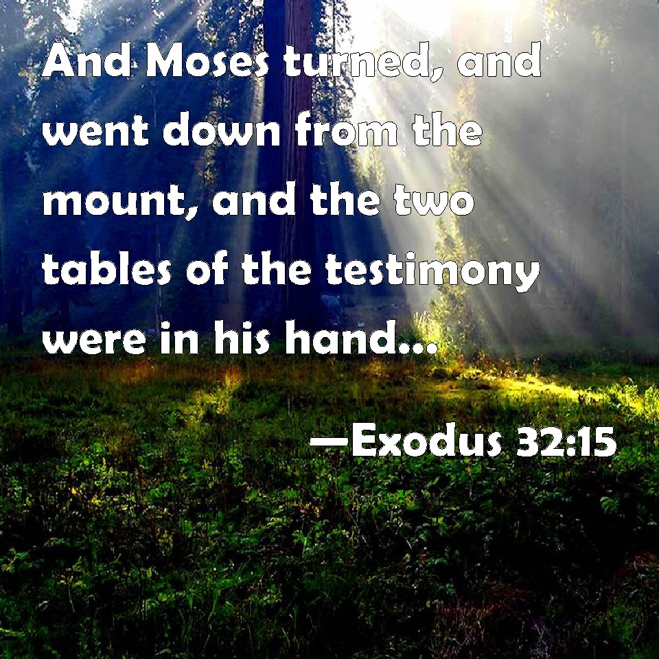 Choose a Background Exodus 32:15 And Moses turned, and went down from the mount, and the two tables of the testimony were in his hand: the tables were written on both their sides; on the one side and on the other were they written. KJV: And Moses turned, and went down from the mount, and the two tables of the testimony were in his hand: the tables were written on both their sides; on the one side and on the other were they written. DRB: And Moses returned from the mount, carrying the two tables of the testimony in his hand, written on both sides, DBT: And Moses turned and went down from the mountain, with the two tables of the testimony in his hand tables written on both their sides: on this side and on that were they written. ERV: And Moses turned, and went down from the mount, with the two tables of the testimony in his hand; tables that were written on both their sides; on the one side and on the other were they written. WBT: And Moses turned, and went down from the mount, and the two tables of the testimony were in his hand: the tables were written on both their sides; on the one side and on the other were they written. WEB: Moses turned, and went down from the mountain, with the two tablets of the testimony in his hand; tablets that were written on both their sides; on the one side and on the other they were written. YLT: And Moses turneth, and goeth down from the mount, and the two tables of the testimony are in his hand, tables written on both their sides, on this and on that are they written;Links Exodus 32:15 NIV • Exodus 32:15 NLT • Exodus 32:15 ESV • Exodus 32:15 NASB • Exodus 32:15 KJV • Exodus 32:15 Interlinear • Exodus 32:15 Commentaries • Exodus 32:15 Parallel Texts • Exodus 32:15 Bible Apps • Exodus 32:15 Parallel • Bible Hub |