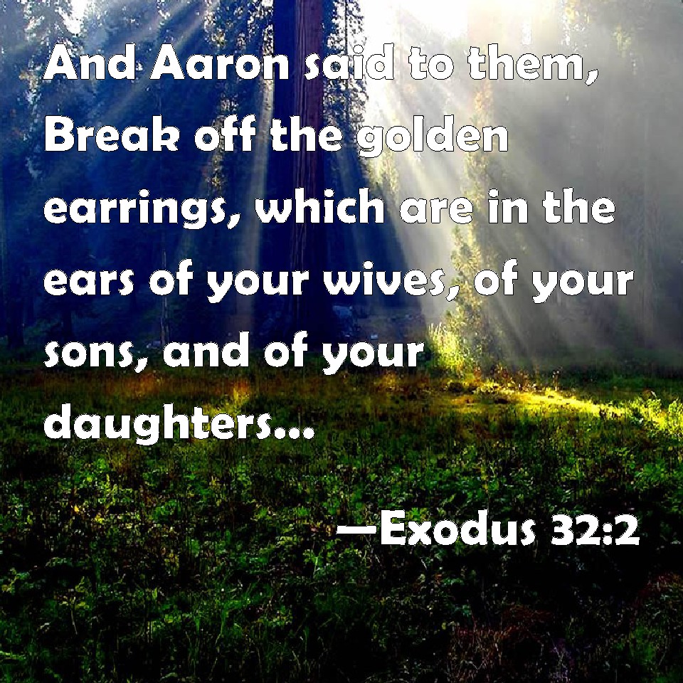 Choose a Background Exodus 32:2 And Aaron said to them, Break off the golden earrings, which are in the ears of your wives, of your sons, and of your daughters, and bring them to me. KJV: And Aaron said unto them, Break off the golden earrings, which are in the ears of your wives, of your sons, and of your daughters, and bring them unto me. DRB: And Aaron said to them: Take the golden earrings from the ears of your wives, and your sons and daughters, and bring them to me. DBT: And Aaron said to them, Break off the golden rings that are in the ears of your wives, of your sons, and of your daughters, and bring them to me. ERV: And Aaron said unto them, Break off the golden rings, which are in the ears of your wives, of your sons, and of your daughters, and bring them unto me. WBT: And Aaron said to them, Break off the golden ear-rings which are in the ears of your wives, of your sons, and of your daughters, and bring them to me. WEB: Aaron said to them, "Take off the golden rings, which are in the ears of your wives, of your sons, and of your daughters, and bring them to me." YLT: And Aaron saith unto them, 'Break off the rings of gold which are in the ears of your wives, your sons, and your daughters, and bring in unto me;'Links Exodus 32:2 NIV • Exodus 32:2 NLT • Exodus 32:2 ESV • Exodus 32:2 NASB • Exodus 32:2 KJV • Exodus 32:2 Interlinear • Exodus 32:2 Commentaries • Exodus 32:2 Parallel Texts • Exodus 32:2 Bible Apps • Exodus 32:2 Parallel • Bible Hub |